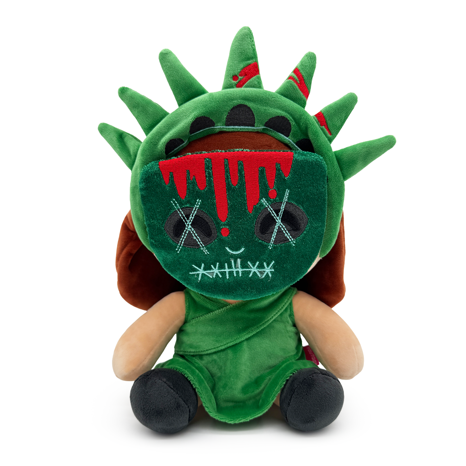 It’s that time of year again! Are you ready for the annual Purge? Because ready or not, it’s coming for you! Sitting at 9 inches tall as the perfect symbol of liberty and ‘freedom’, Lady Liberty wears a green mask with blood dripping from the top as its dark eyes are crossed out to match an unsettling stitched mouth. With the long spikes of her green crown smeared with blood and reaching out from above, her brown hair hangs down to her shoulders, she wears a simple green dress wrapping over her shoulders and black shoes. This plush is packed to the seams with 100% PP cotton and is made of the softest minky material with accents of brushed shiny, absolutely perfect for cuddling all year except for a certain 12 hours…