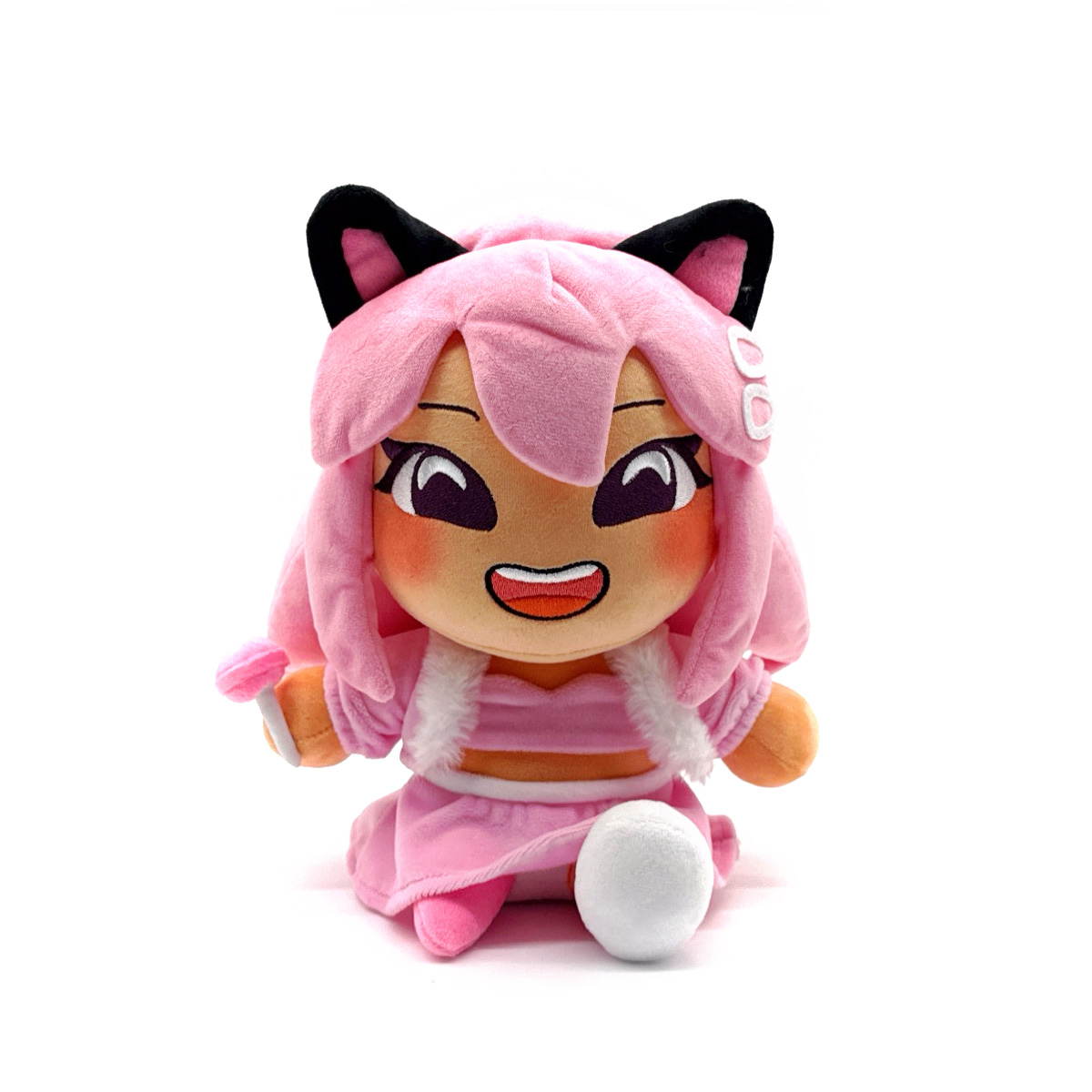 Fresh from the runways, we have fashion icon Layla Roblox here to show off her plush debut! Sitting at 9 inches tall with her legs kicked forward as a white sneaker covers one foot and her right leg is a short pink Korblox, she's styled wearing a pink skirt, bralette and coat with furry white trim. Holding a pink lollipop in her right hand, Layla's long hair and bangs frame her happy blushing face as dark cat ears poke out from the top of her head. This plush is packed to the seams with 100% PP cotton and is made of normal and long pile minky materials with accents of felt, perfect for cuddling or serving looks with!