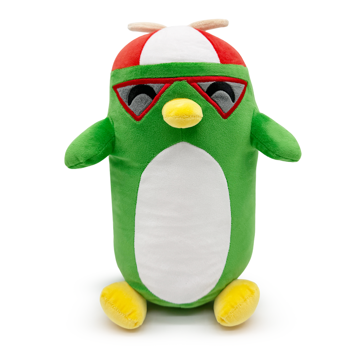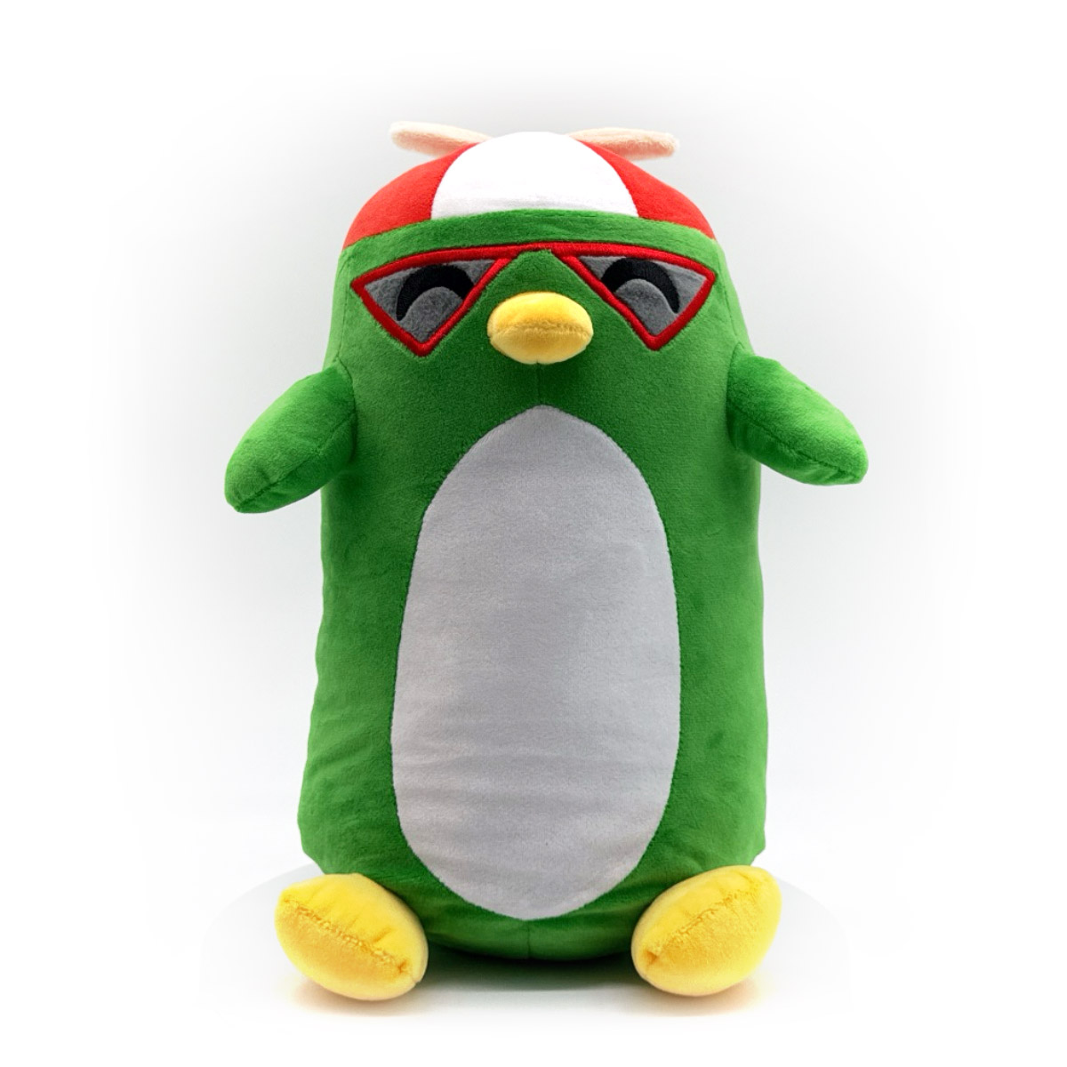 Now would you just look at this boi! So elegant, majestic and, importantly, long! That's right, Isaac's back and streeeeetched out for this brand new plush which takes his usual round self and pulls him into the best friend shape there is as he sits at 12 inches tall. With short green wings sticking out from a thick bod and an oval white belly sitting above small yellow feet, his small beak curves into a slight frown as triangular red-trimmed shades cover his eyes and his iconic red and white helicopter hat sits atop his head. This plush is packed to the seams with 100% PP cotton and is made of a mix of minky and spandex materials with accents of felt and pvc, perfect for cuddling or just being long with!