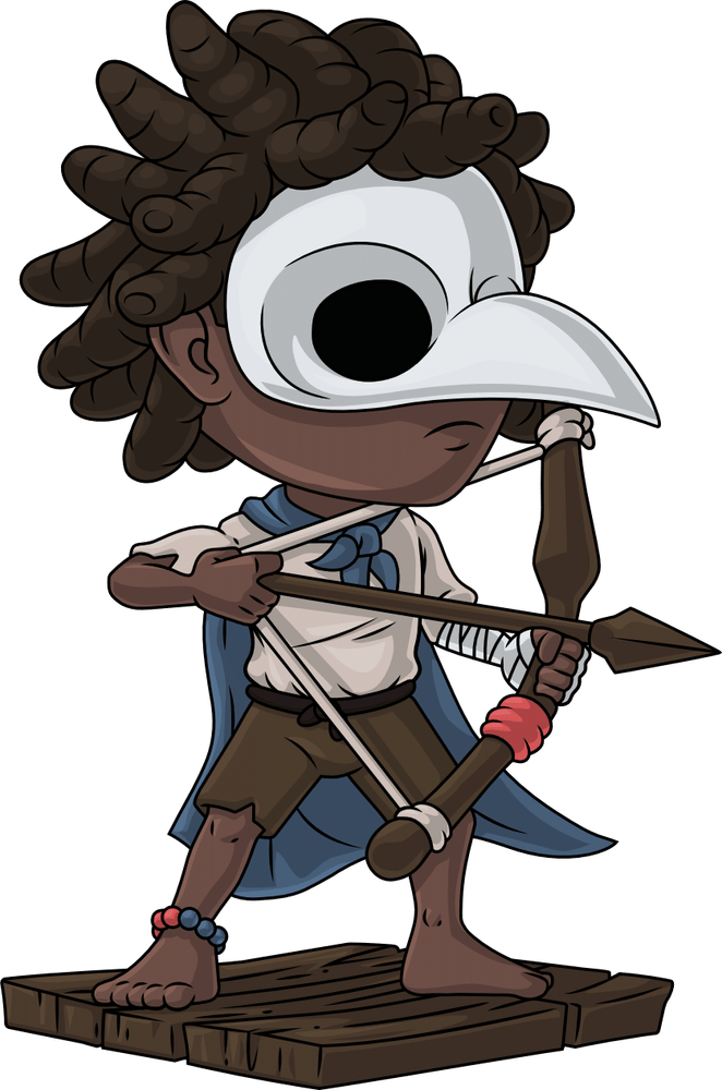 The next stop on Low's escape from the Spiral is Youtooz! Standing bravely at 4.5 inches tall with an arrow drawn in his makeshift brown bow., Low's dressed in brown shorts, a white t-shirt and a blue cape that flows in the wind behind him. Accessorized with a blue and red anklet along with a white raven mask that covers his face, thick braids of black hair flow out from the top of his head. The exterior of his packaging has been illustrated to show Low walking across a wooden beam in front of towering buildings. The interior is then covered in a pattern of obscure eyes which work their way onto the protective sleeve that's flooded with blue light from a pale city as his figure can be seen through the large clear window at its front.. This collectible ships in a matte, embossed, protective outer sleeve and a custom-sized plastic protector for maximum protection during shipping.