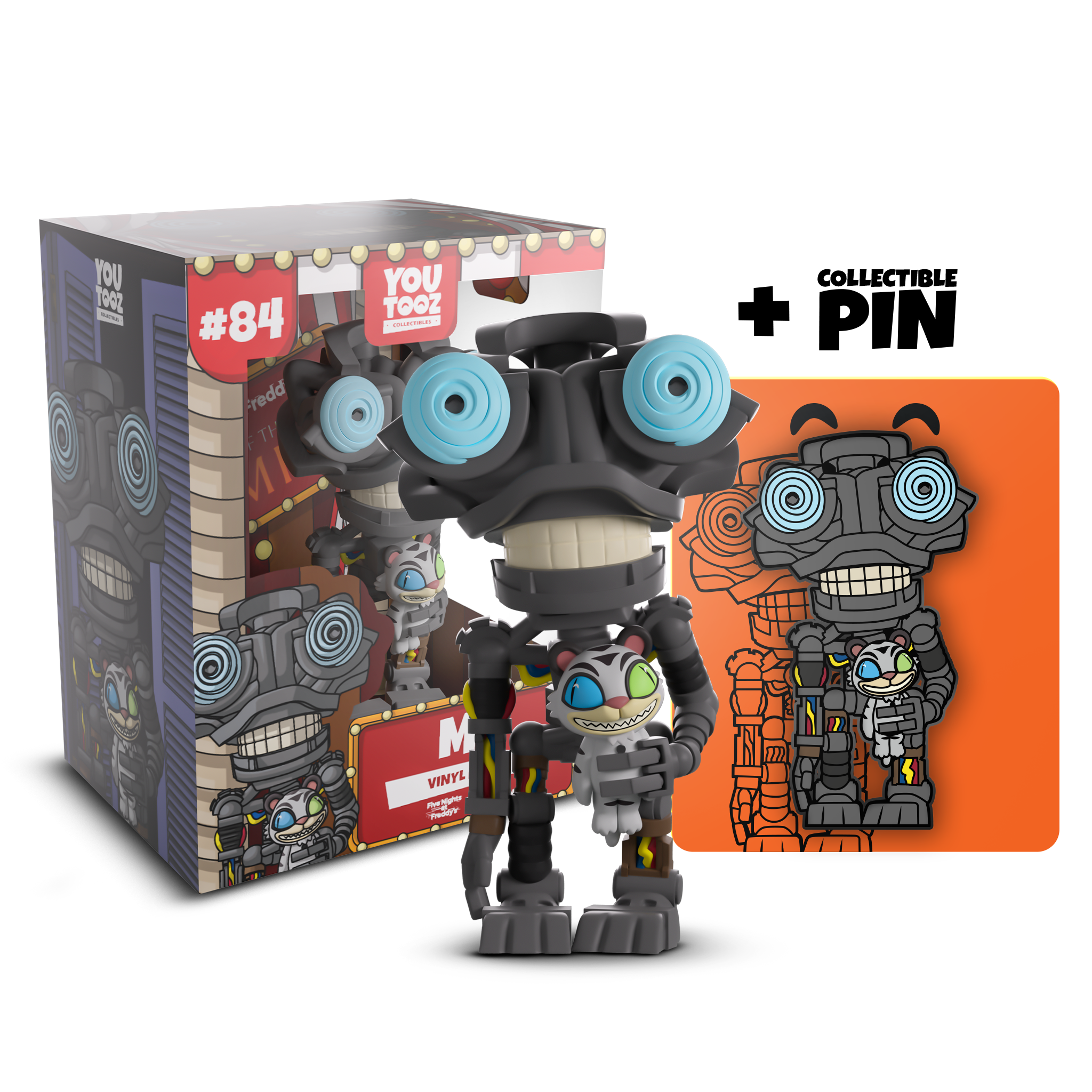 We thought we were done with M2 at Murray’s Costume Manor, but they’ve proved that was only the beginning with their Youtooz debut! Standing at 4.9 inches tall with bright blue spiraling eyes peering out from their grey face, which has thick wires wrapping around to form a wide skull, pale teeth almost form a smile as long arms and legs hang from the ball joints of their narrow endoskeleton. With dark piping and bright red, yellow, and blue wires covering thin limbs, they hold their precious White Tiger doll in a clamped hand as the other dangles to the side. The exterior of their packaging seems to be standing alone in a dark bedroom that has clouds and stars on its striped walls. While the interior puts them right in the center of a maroon and yellow circus tent with long curtains and strings of lights, this then continues onto the protective sleeve where their figure can be seen through the large clear window at the packaging’s front. This collectible ships in a matte, embossed, protective outer sleeve and a custom-sized plastic protector for maximum protection during shipping.