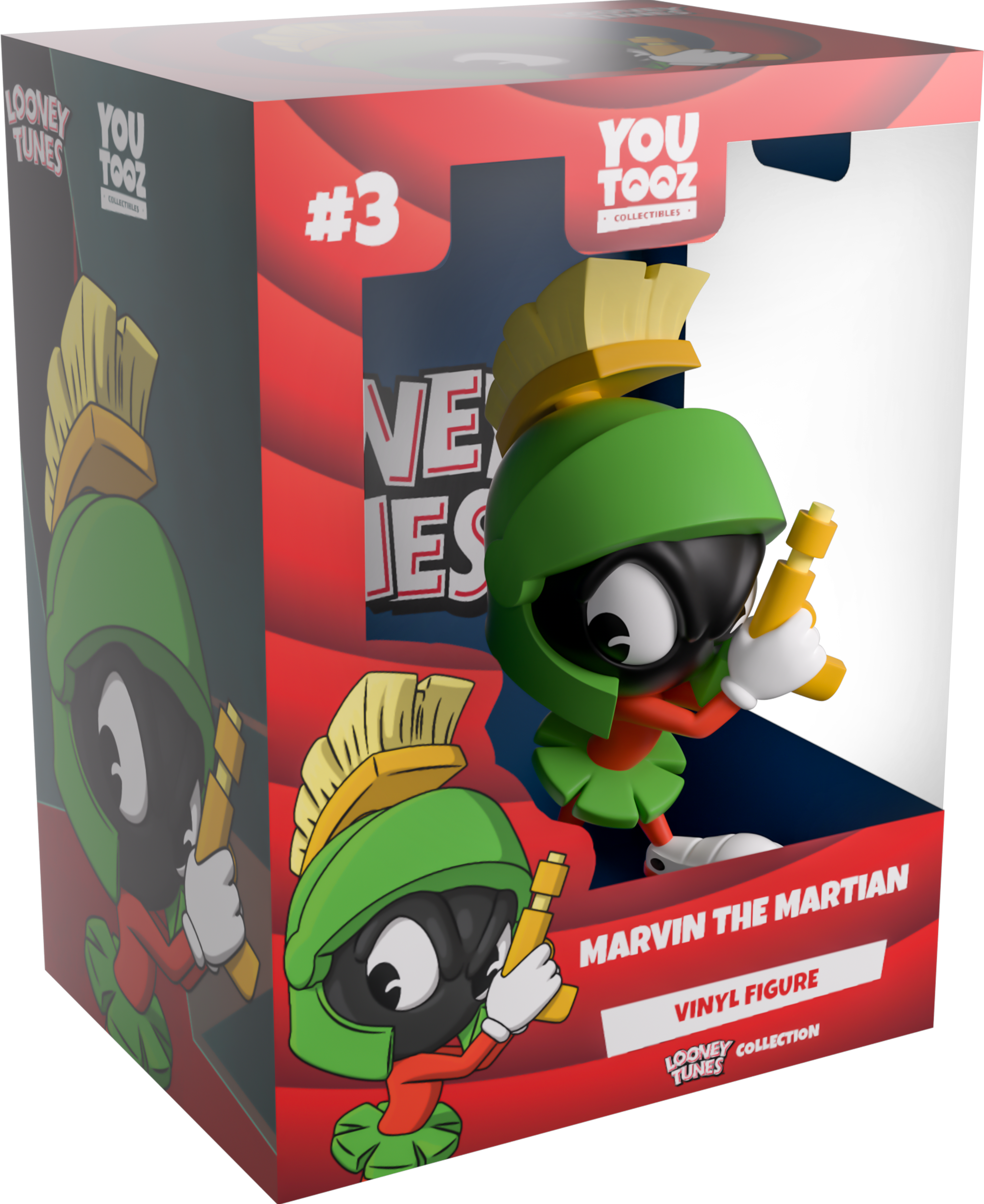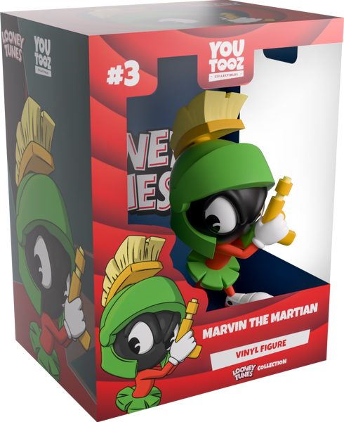 The Earth is in danger once again because Marvin the Martian has arrived at Youtooz for his debut! Standing at 4.9 inches tall and holding a golden ray gun in a white gloved hand up to his face, huge eyes glance to the side under thick eyebrows as a green helmet with a yellow crest covers his head. With a green skirt fanning out around his waist that matches his helmet, his body is a bright red as he wears huge white sneakers with red soles. The exterior of his packaging features the end of his huge telescope. The interior is then a deep blue with the ‘Looney Tunes’ logo printed on the back, while a gradient of red rings make their way over the protective sleeve as his figure can be seen through the large, clear window at the packaging’s front. This collectible ships in a matte, embossed, protective outer sleeve and a custom-sized plastic protector for maximum protection during shipping.