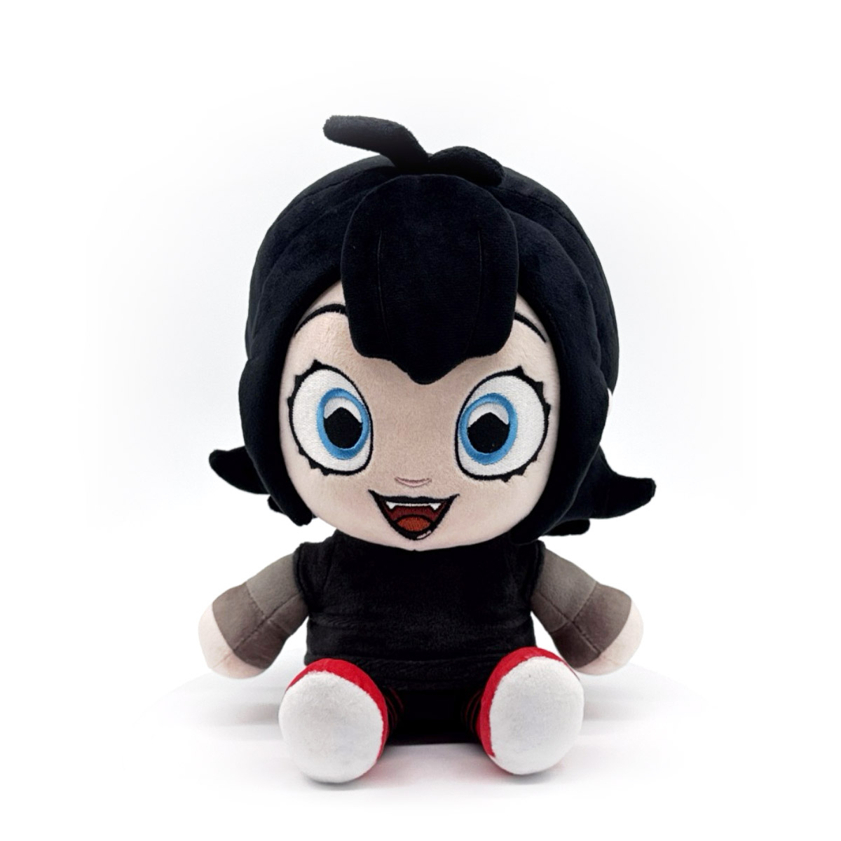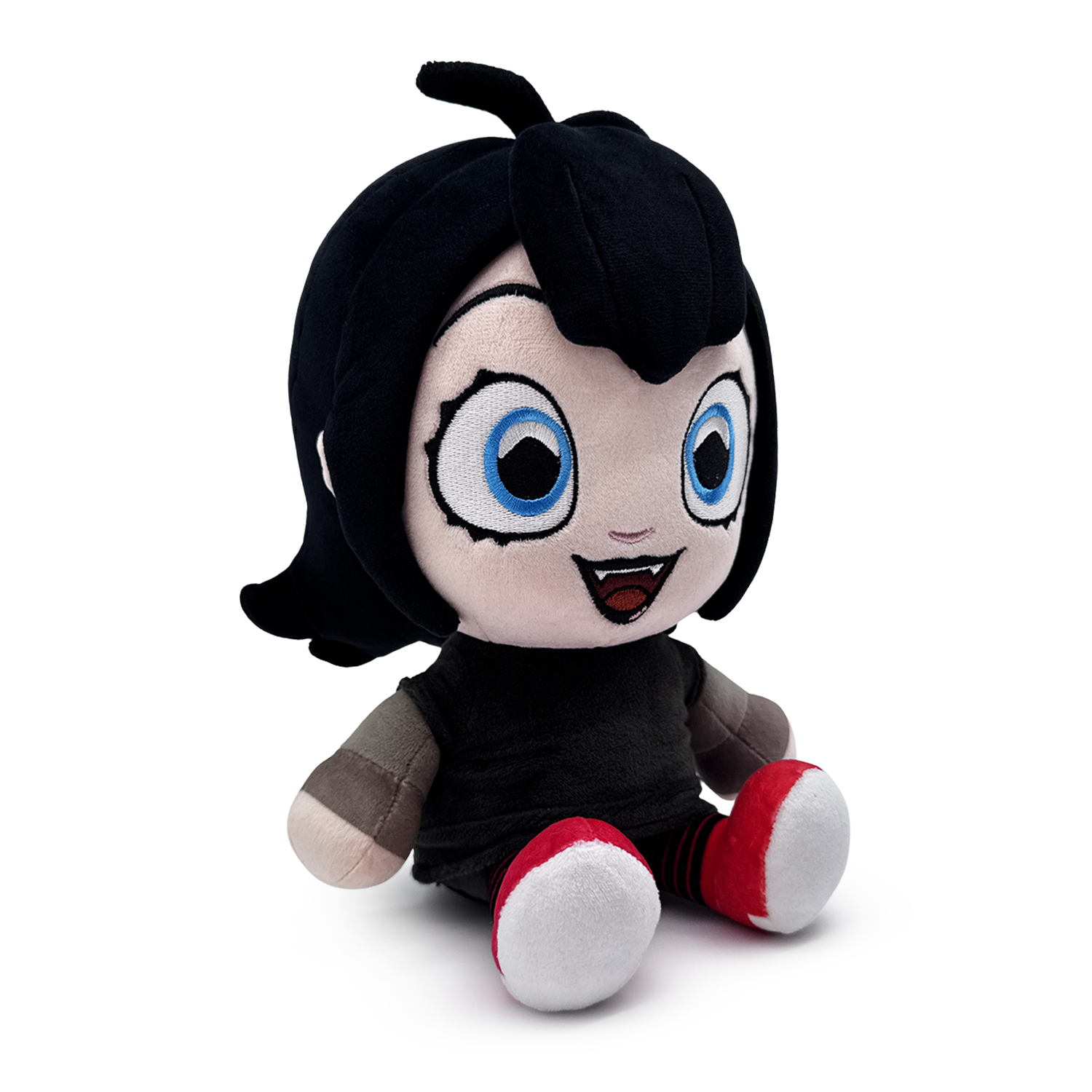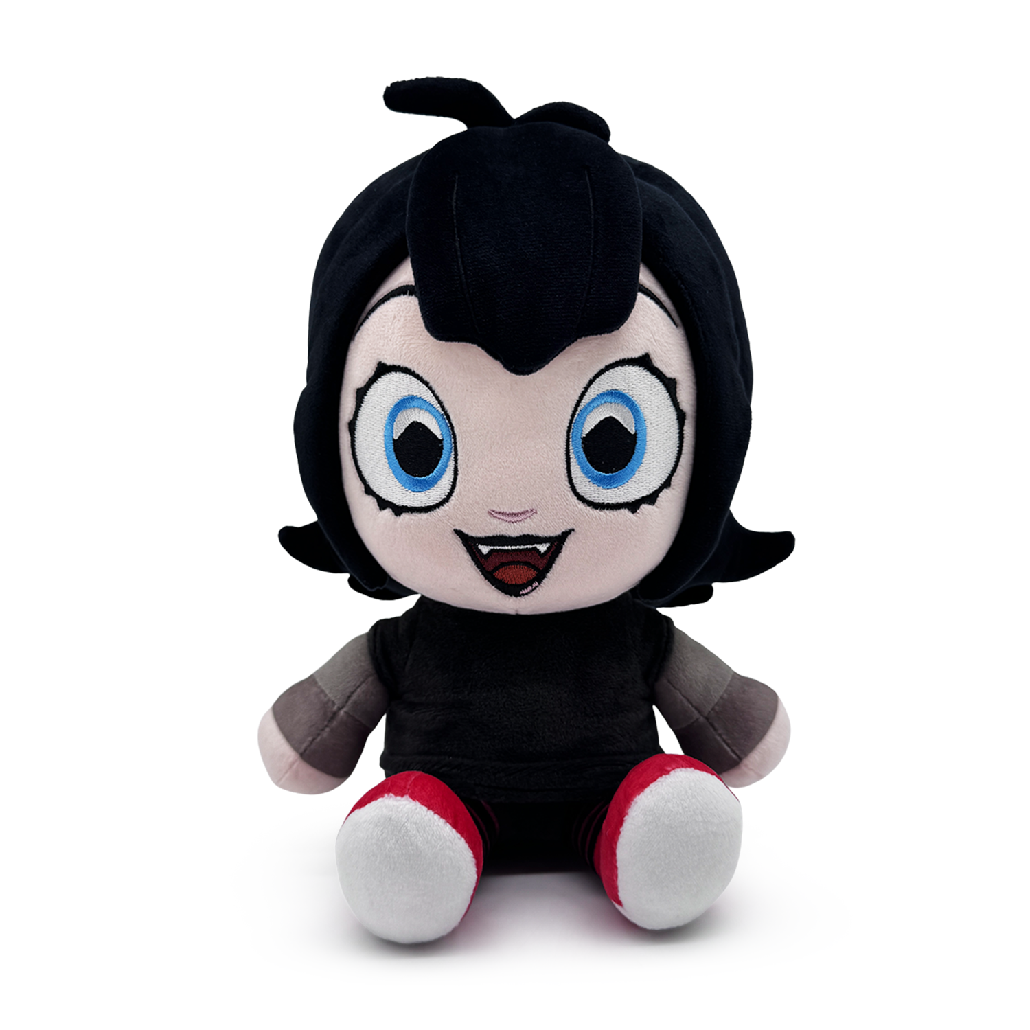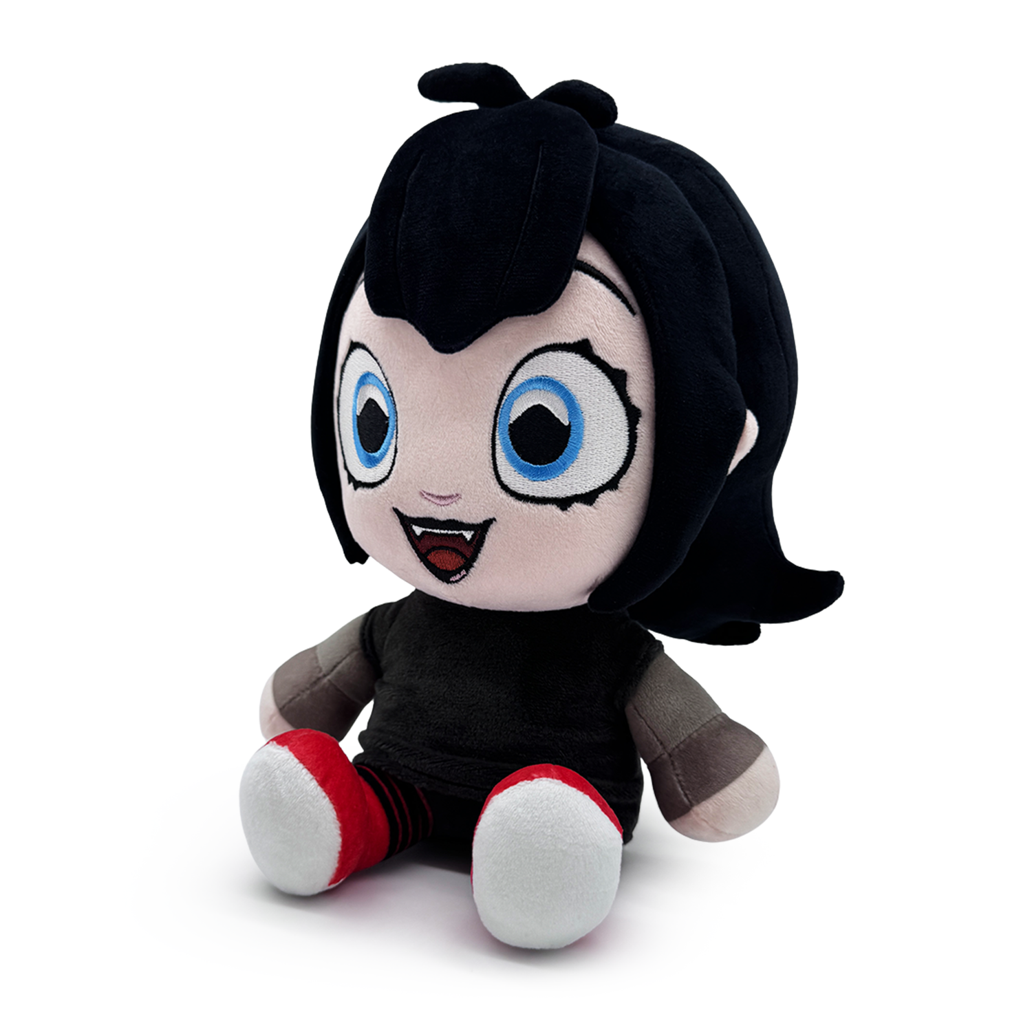 Mavis has seen a lot of things in her life, but herself as a Youtooz plush? Now that’s a first! Sitting at 9 inches tall with huge blue eyes that are surrounded with dark makeup and a fanged smile beaming from her pale face as black hair falls over her forehead in a thick fringe and flicks out above her shoulders, she wears a black dress that has light grey sleeves extending over her hands along with black and red striped tights that lead down to her two-tone sneakers. This plush is packed to the seams with 100% PP cotton and is made of the softest minky material, absolutely perfect for cuddling or being curious with!