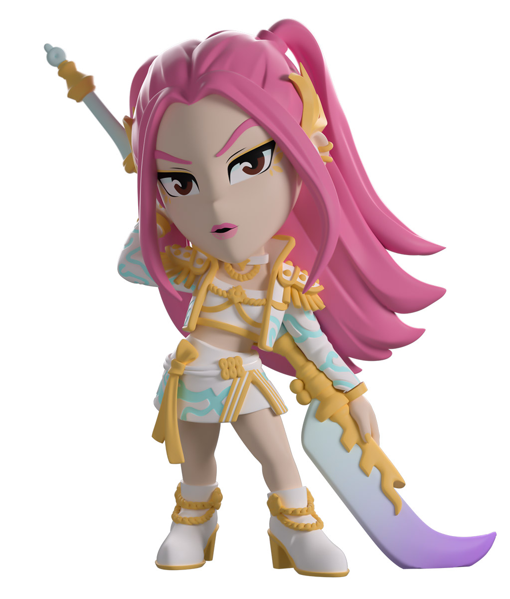 Watch out, demons, Mira’s here to seal you away with her Youtooz debut! Standing at 4.7 inches tall with her hip popped to the side as she holds the hilt and blade of the long gok-do flung over her shoulder, her lips rest slightly open as a pink fringe parts in the middle to frame her face and sweep across her shoulders. Dressed in an elegant gold-trimmed white jacket over a simple tank top, along with a short skirt, light purple and blue patterns run up her sleeves as she wears platform ankle boots. The exterior of her packaging sees a glowing gok-do amongst hazy pink and blue hues, while the interior is filled with a deep blue that’s covered in small white dots. The protective sleeve is then a soft blue to purple gradient with thin lines wrapping over its surface, as her figure can be seen through the large, clear window at the packaging’s front. This collectible ships in a matte, embossed, protective outer sleeve and a custom-sized plastic protector for maximum protection during shipping.