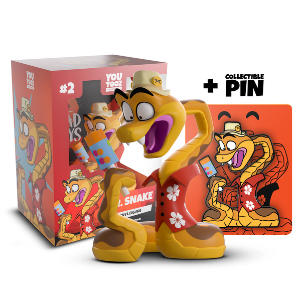 This safe needs crackin' but give him a few minutes, Mr. Snake wants to finish his push pop first! Slithering in at 4.2 inches tall to make his Youtooz debut, he looks down excitedly at the push pop held in the tip of his tail and is dressed in a red shirt with a white floral print and a khaki bucket hat. The exterior of his packaging has been illustrated to show the inside of a frosty freezer, while the interior is a textured orange with the Bad Guys 2 logo. The protective sleeve features a red sky over the city in the distance as his figure can be seen through the large clear window at its front. This collectible ships in a matte, embossed, protective outer sleeve and a custom-sized plastic protector for maximum protection during shipping.