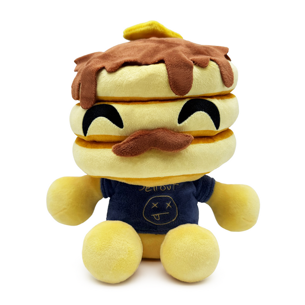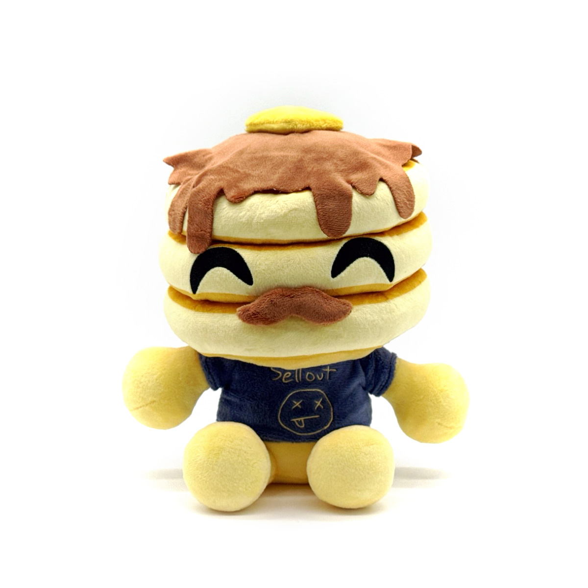 Ain’t nothing short about this stack! MrPancake’s back for another deliciously syrup-drenched plush! Sitting at 9 inches tall with a thick mustache on the front of their triple-stacked pancake head as deep brown syrup drizzles over the edges and a single slab of butter rests on the top, they wear a blue t-shirt that says ‘sellout’ on the front as arms with round hands rest to either side and their legs kick forward lazily. This plush is packed to the seams with 100% PP cotton and is made of the softest minky material, absolutely perfect for cuddling or guzzling syrup with!
