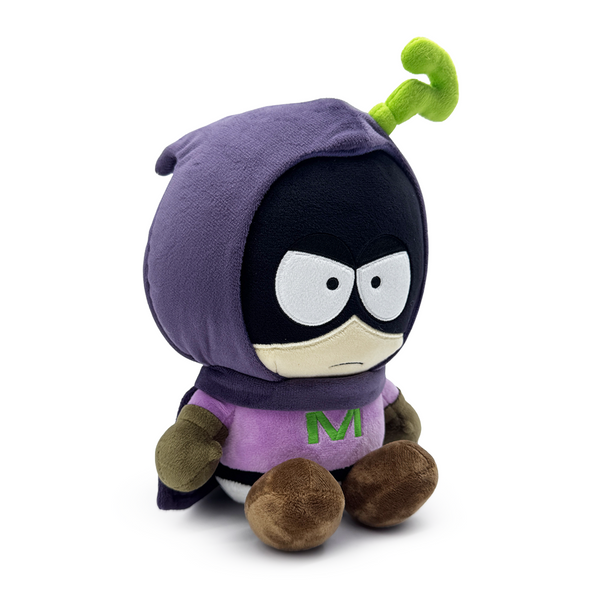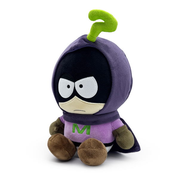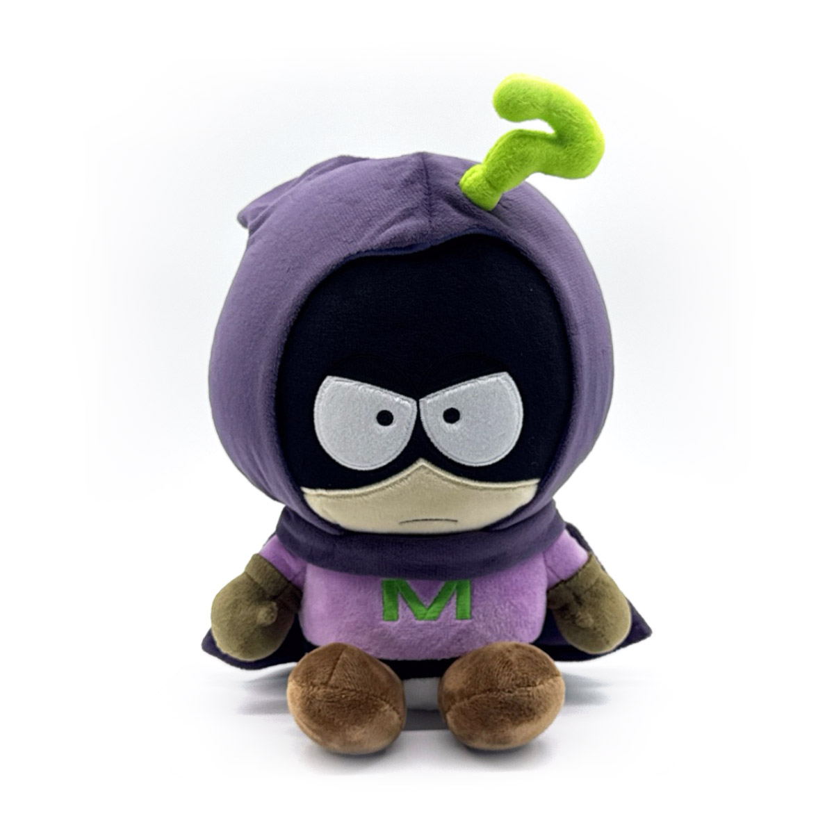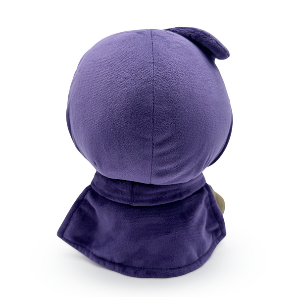 Mysterion has emerged from the shadows to protect Youtooz from Professor Chaos! Sitting at 9 inches tall with a thin frown and serious eyes staring out from the black mask covering his face, a purple hood wraps around his head and neck with a curved point at the back as a green question mark pokes out from the top. Shrouded in mystery with a long purple cape hanging over his back, he wears a light purple shirt with a green ‘M’ on the front, along with dark gloves, black pants and brown shoes. This plush is packed to the seams with 100% PP cotton and is made of the softest minky material, absolutely perfect for cuddling or fighting crime with!