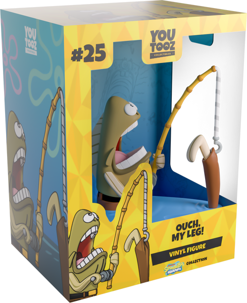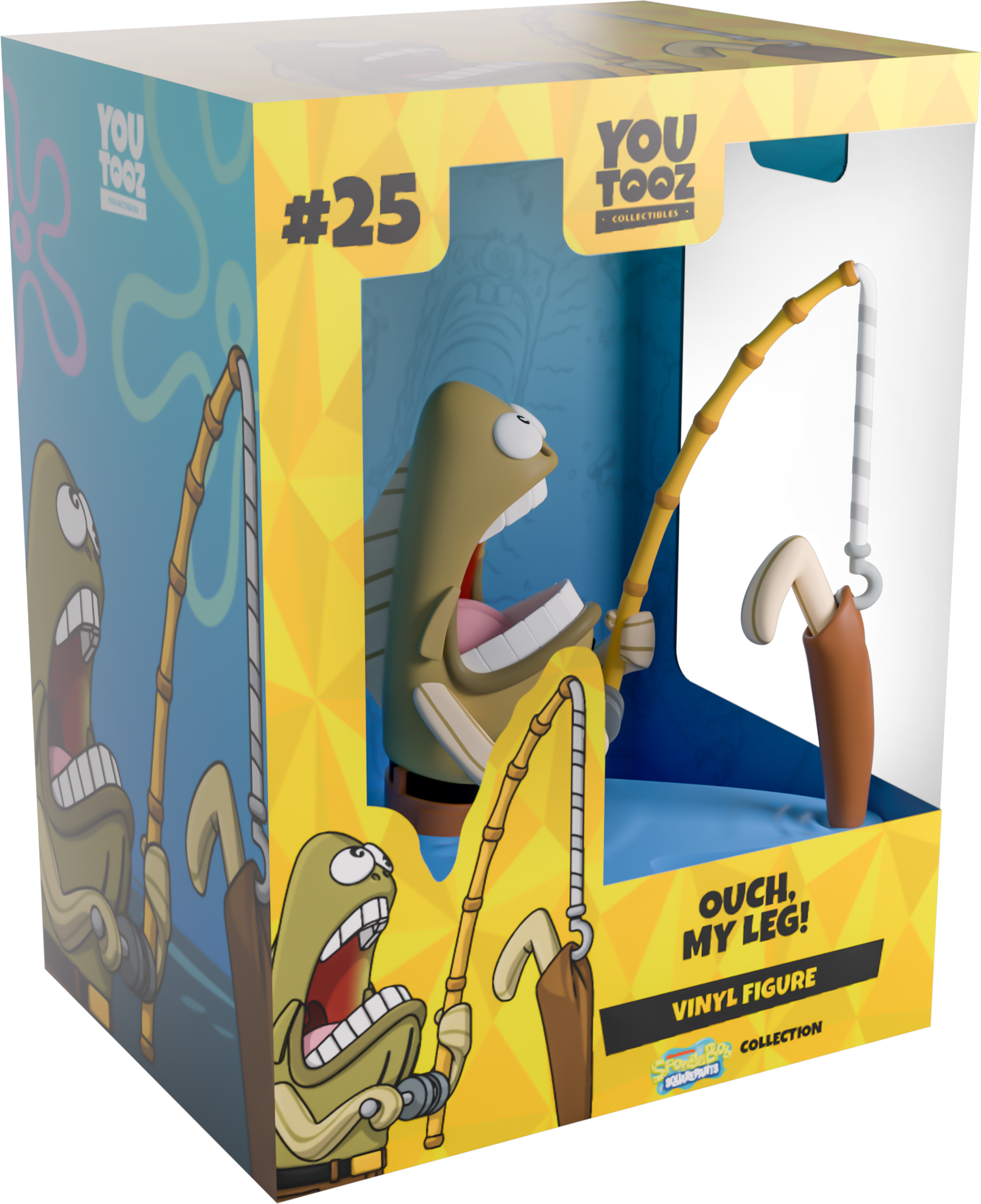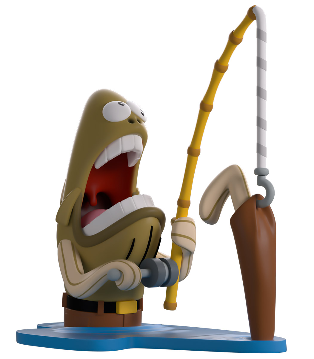 Will somebody give Fred a break, please? The poor fish keeps hurting his leg! This brand-new collectible figure shows Fred as he is waist-deep in water holding a fishing pole that has caught onto the cuff of one of his pant legs, pulling his leg up painfully. Fred is screaming in pain as his mouth is wide open mid-scream. The windowed display box has been illustrated to show Fred fishing while rolling green hills can be seen behind him, with pink coral mountains seen in the distance. The interior of the box has been designed with a blue background with numerous different designs of Spongebob all across the inside of the box. The protective sleeve is designed with a mosaic yellow pattern. This collectible ships in a matte, embossed, protective outer sleeve and a custom-sized plastic protector for maximum protection during shipping.