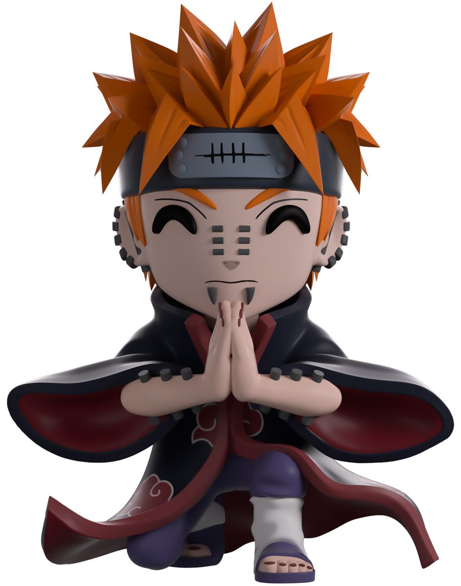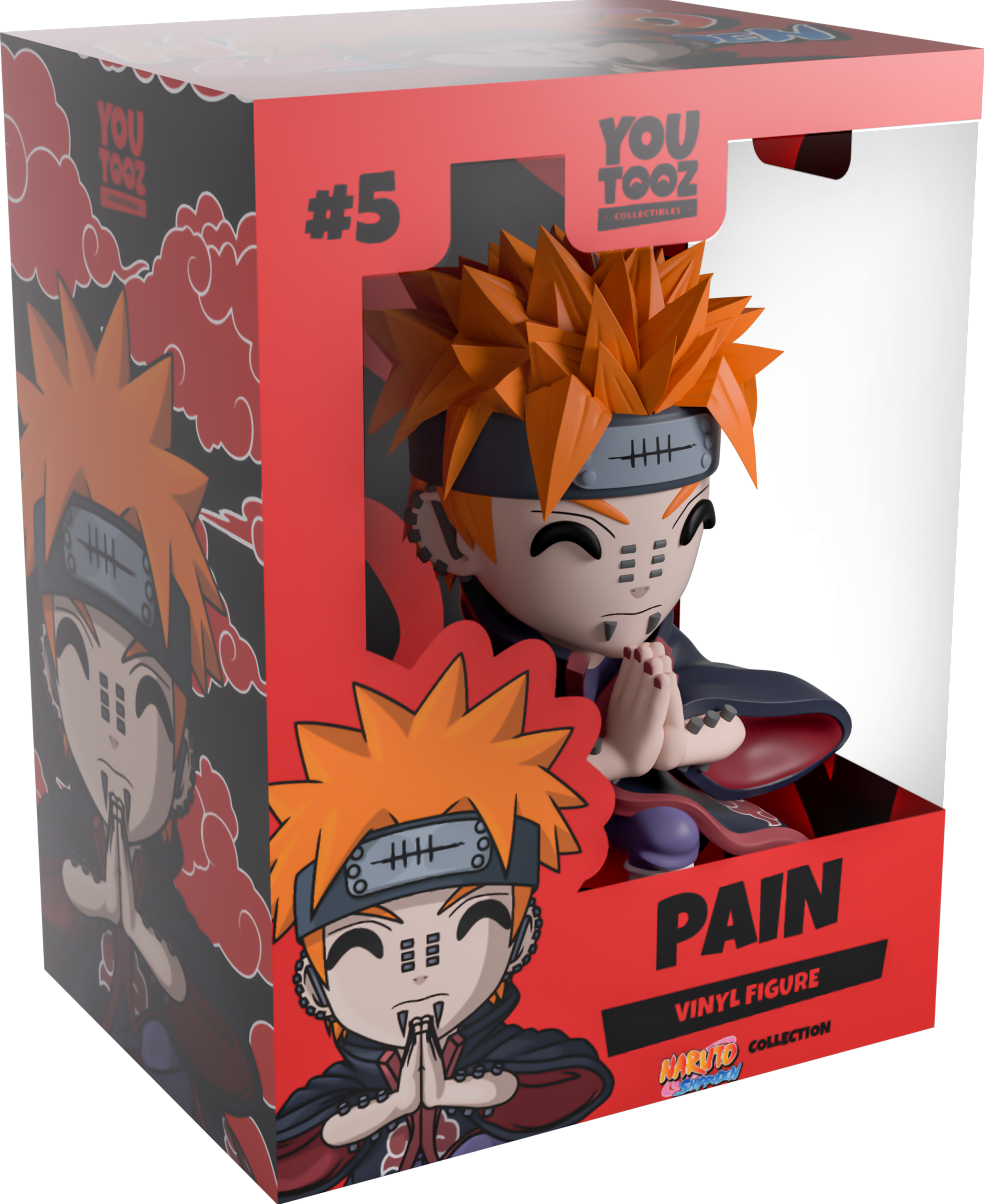 Pain has arrived at Youtooz to show us what true pain really looks like with his debut! Kneeling at 4.2 inches tall with hands pressed together at his front as he prepares to explode with an almighty jutsu, the long sleeves of his black akatsuki robe, that’s covered in swirling red clouds fly around his arms and billow around his waist. With spikey orange hair falling over the Hidden Rain Village headband that has a slash through the plate on its front, black piercings cover his arms, ears, the bridge of his nose and lower lip as he wears blue trousers and matching sandals. The exterior of his packaging is covered in deep red billowing clouds upon a black background, while the interior is a simple pattern of varying-sized swirls. The protective sleeve then carries the same clouds around the exterior as his figure can be seen through the large, clear window at its front. This collectible ships in a matte, embossed, protective outer sleeve and a custom-sized plastic protector for maximum protection during shipping.