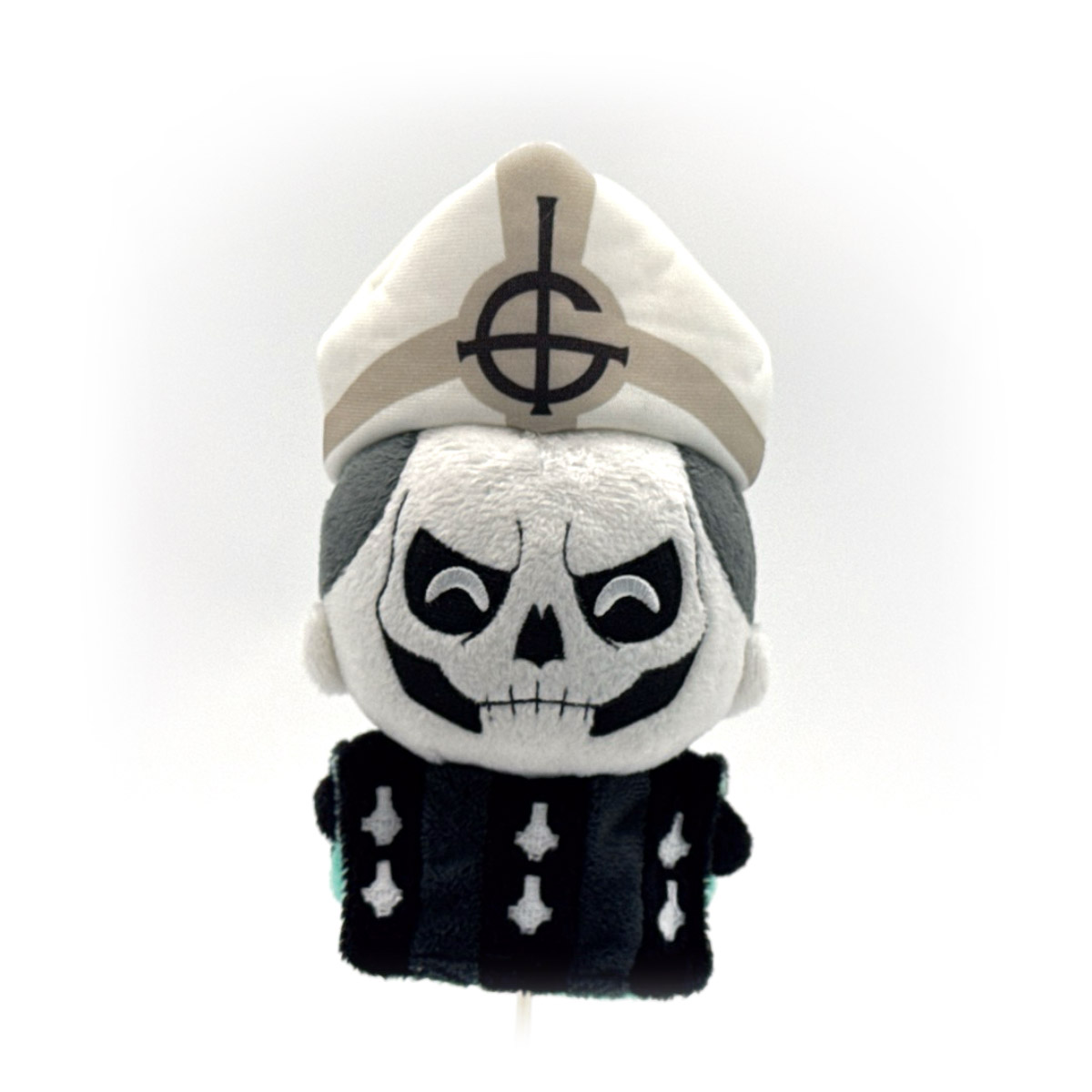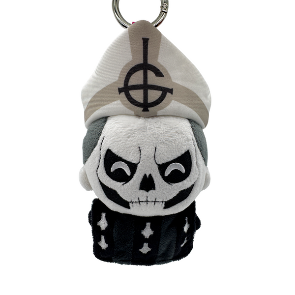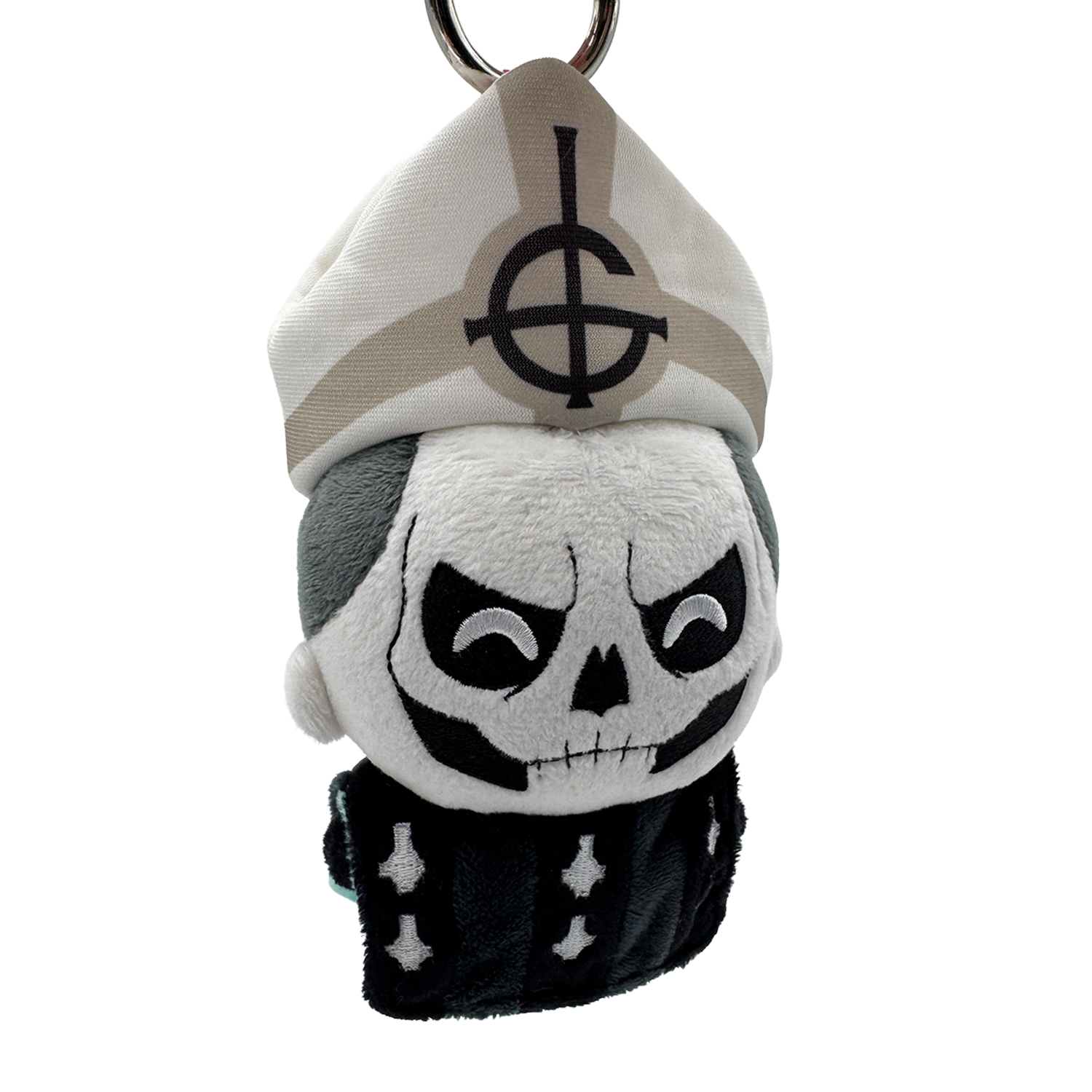 The Sermon’s about to begin, and who better to lead it than Papa II?! Standing at 5 inches tall with furrowed eyes on his skeletal white face, a white and grey mitre rests atop his head as he wears a long black cloak patterned with white inverted crosses. This keychain is packed to the seams with 100% PP cotton and is made of the softest minky material with a keyring attached to the top by a pink tag, absolutely perfect to hang from your backpack, purse, pants or wherever you want to show you’re ready to rock!