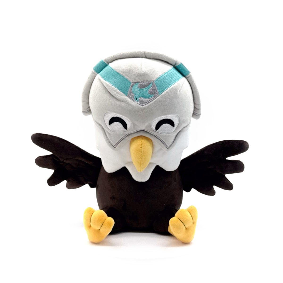 Eagly has swooped into Youtooz to clean up crime with his plush debut! Sitting at 9 inches tall with his yellow beak poking out from the bottom of a grey helmet that has a pair of light blue lines running across the forehead towards an dove emblem at the center, black wings stretch out to either side as yellow claws kick forwards and short tail fans out from his back. This plush is packed to the seams with 100% PP cotton and is made of the softest minky material, absolutely perfect for cuddling or saving the world with?