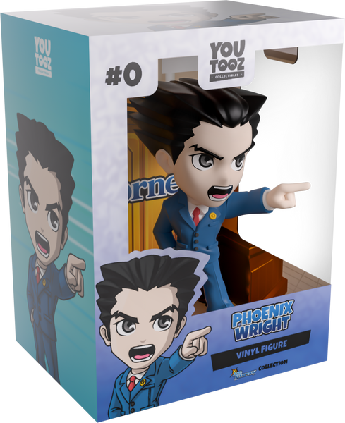 Phoenix Wright has arrived at Youtooz to defend us in the case of not debuting him yet! Standing at 4.5 inches tall as he thrusts his hand forward and points confidently while letting out a firm ‘Objection!’ from his open mouth, angled eyebrows sit over confident eyes as his black hair is slicked back ironically in thick spikes. Wearing a tailored two-piece suit with yellow buttons and an attorney badge on the lapel over his white collared shirt and red tie, his right-hand rests casually in his pocket as his courtroom attire is complete with slick black shoes. The exterior of his packaging sees Phoenix standing behind a desk as he fervently addresses the judge. While the interior looks onto an empty courtroom, this then extends onto the protective sleeve where his figure can be seen through the large clear window at the packaging’s front. This collectible ships in a matte, embossed, protective outer sleeve and a custom-sized plastic protector for maximum protection during shipping.