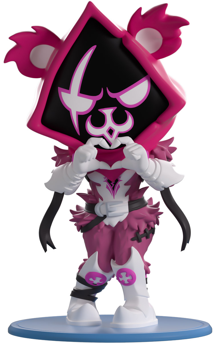There’s no way you’re going to lose now that Pink Raven Team Leader is here for their Youtooz debut! Standing at 4.7 inches tall with her knees touching and making a heart shape to the front with glove-covered hands, a pink and white face with a long scar through the right eyes shines out from the darkness of the hood pulled over her head as a pair of furry ears stick out from the top. Wearing a pink and white outfit with a furry waist and shoulders, a harness is secured around her shoulders as dark straps hang from either arms and wrap around both her waist and shins. The exterior of their packaging sees them amongst a gloomy graveyard, while the interior is covered in a deep pink gradient. A white streak then blasts across the pink and blue protective sleeve as their figure can be seen through the large, clear window at the packaging’s front. This collectible ships in a matte, embossed, protective outer sleeve and a custom-sized plastic protector for maximum protection during shipping.