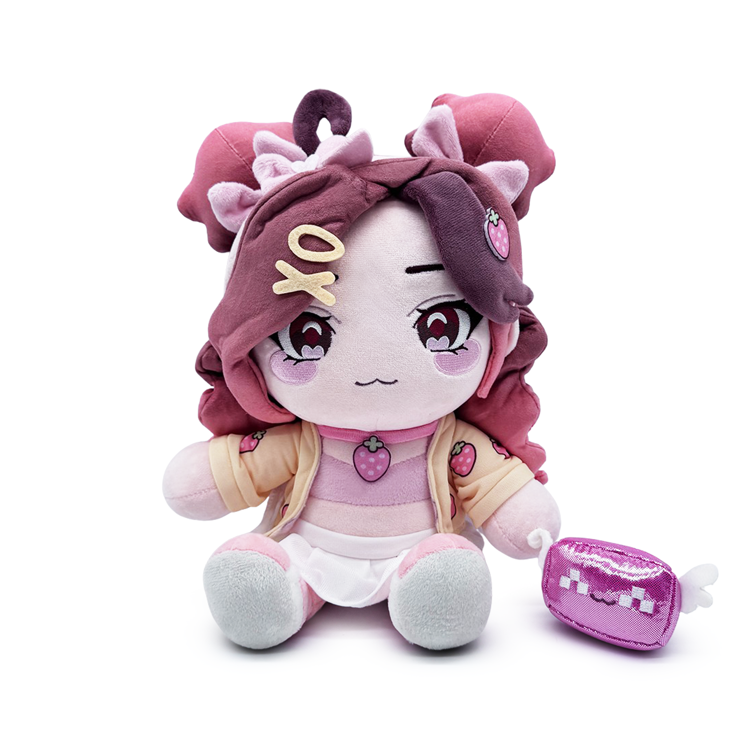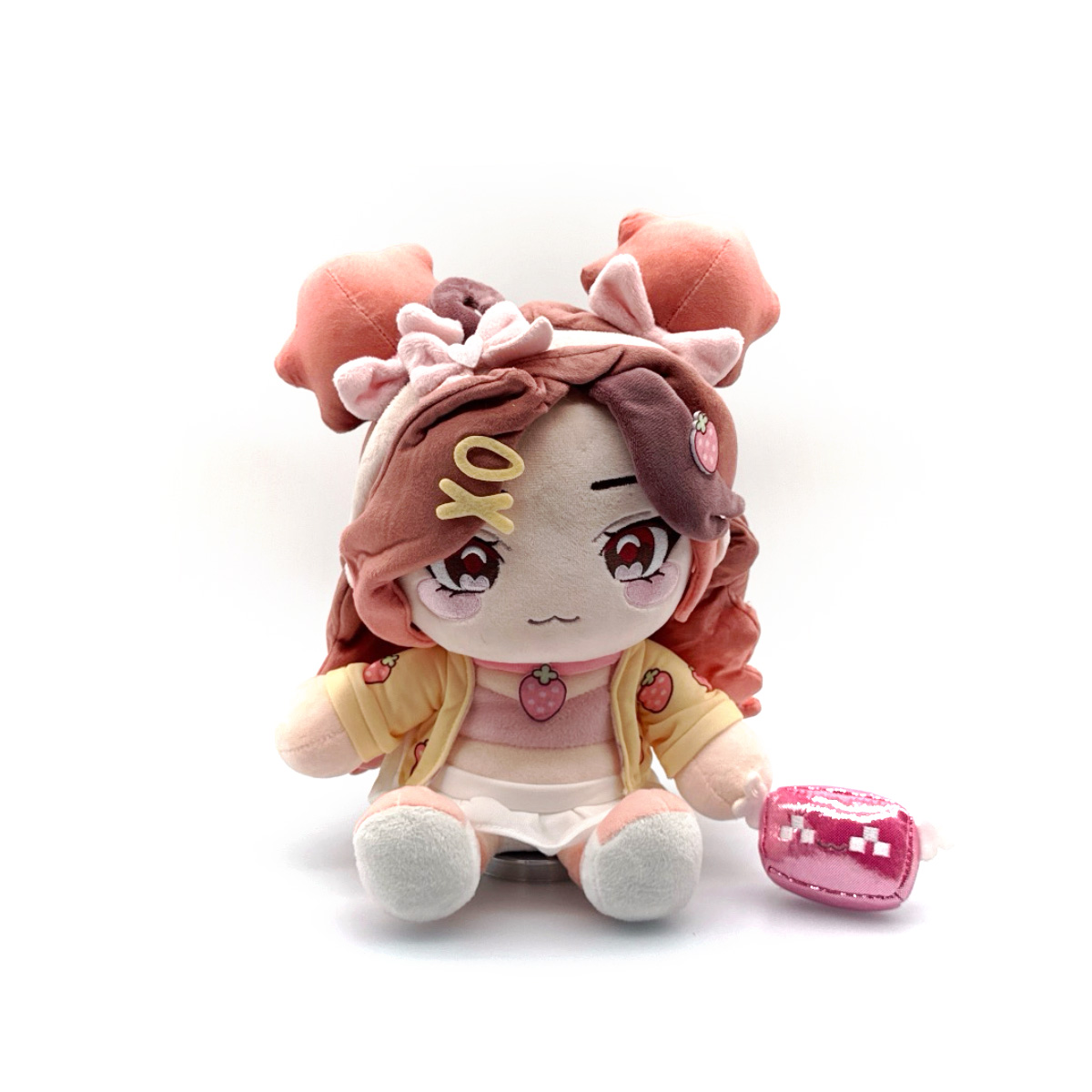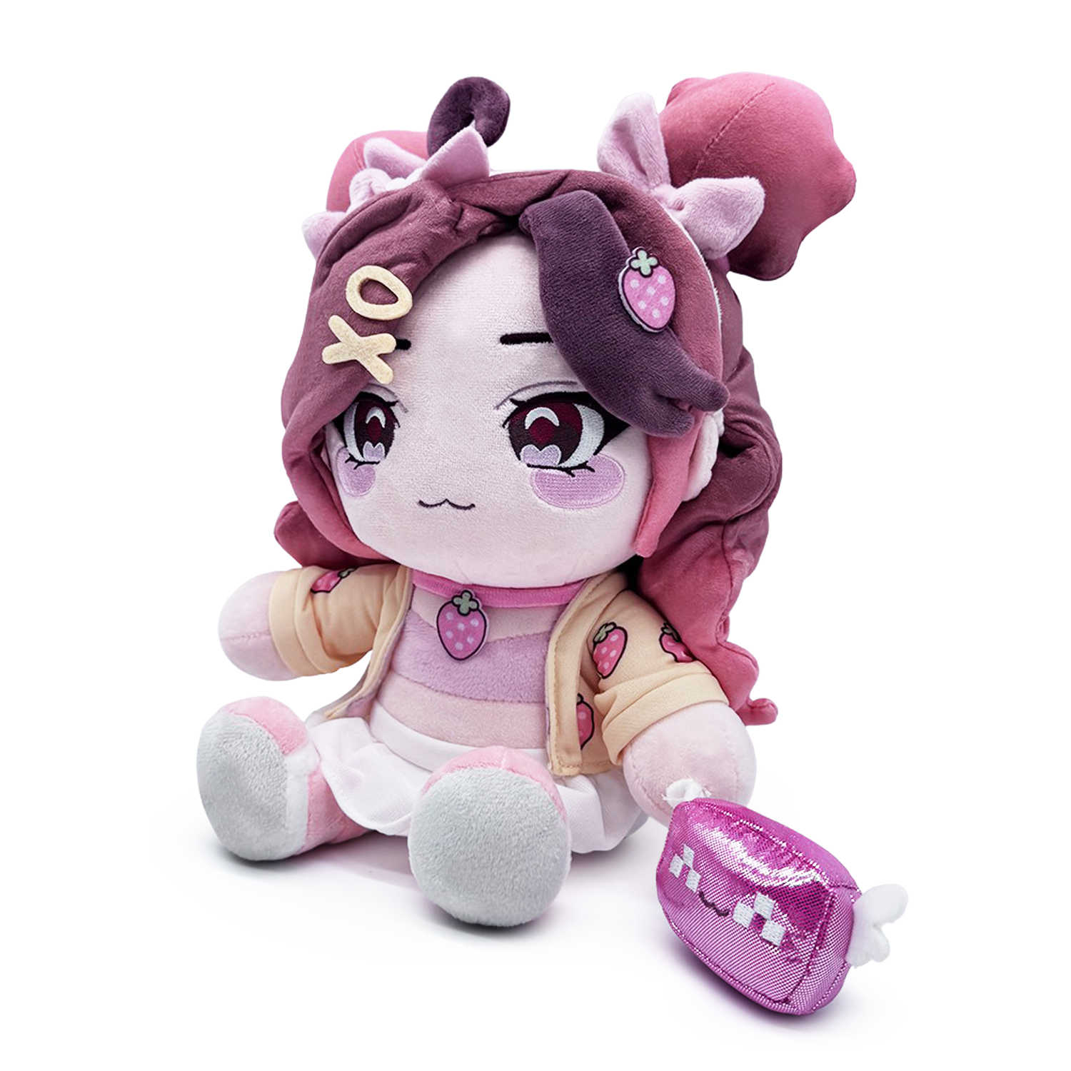 Dressed and ready to impress, Pixiiuwu is taking the stage for her Youtooz plush debut! Sitting at 9 inches tall with soft brown eyes above blushing pink cheeks and a small curved smile, long brown hair with pink tips cascades down either side of her face while being pulled into a pair of buns at the top of her head. Accessorized with fun hair clips and holding a smiling pink block with white wings on her lap, she wears a strawberry print cardigan over a light pink top, along with a white skirt and pink shoes. This plush is packed to the seams with 100% PP cotton and is made of minky and glitter materials with accents of felt, absolutely perfect for cuddling or dressing up with!