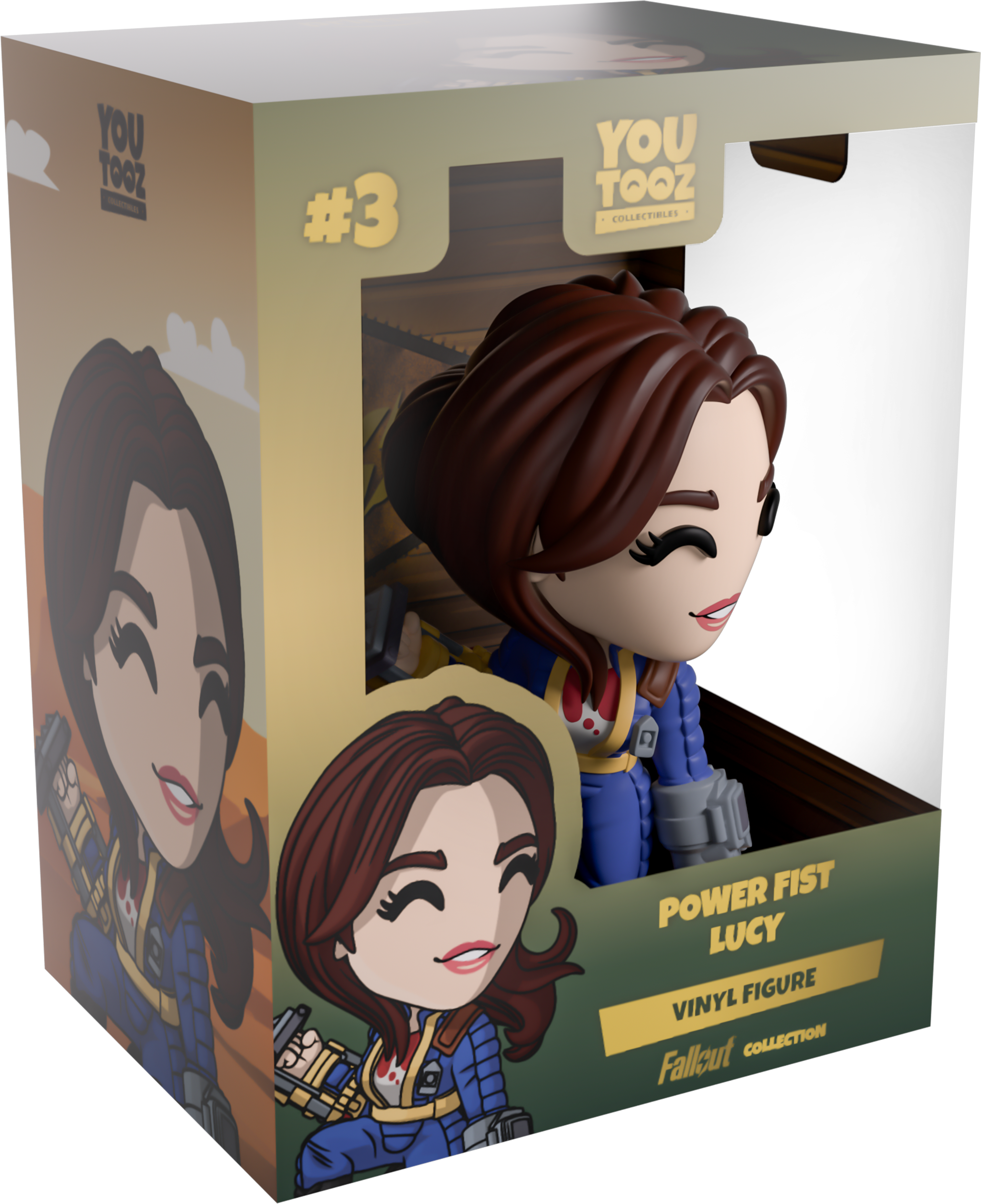 You know, sometimes you really just need to smash your way through life’s problems! And Lucy’s returned to Youtooz to show us exactly how it’s done! Crouched on one knee at 3.6 inches tall with her left hand placed flat on the ground, a devastating Power Fist wraps around her right forearm with its spiked plate at the front of her clenched fist, ready to ‘powerfully’ end any altercation! With a cheery smile on her face, as long brown hair falls down either side and flicks around her shoulder in a thick ponytail, she wears a blue and yellow vault suit over a bloody shirt, along with a grey Pip-Boy and black boots. The exterior of her packaging looks onto the dilapidated New Vegas sign, while the interior is filled with dark brown wood panelling. The protective sleeve then sees a brown silhouette of the treacherous wasteland as her figure can be seen through the large, clear window at the packaging’s front. This collectible ships in a matte, embossed, protective outer sleeve and a custom-sized plastic protector for maximum protection during shipping.