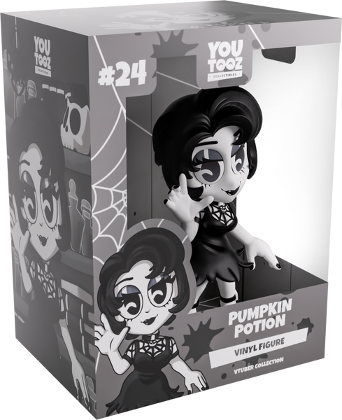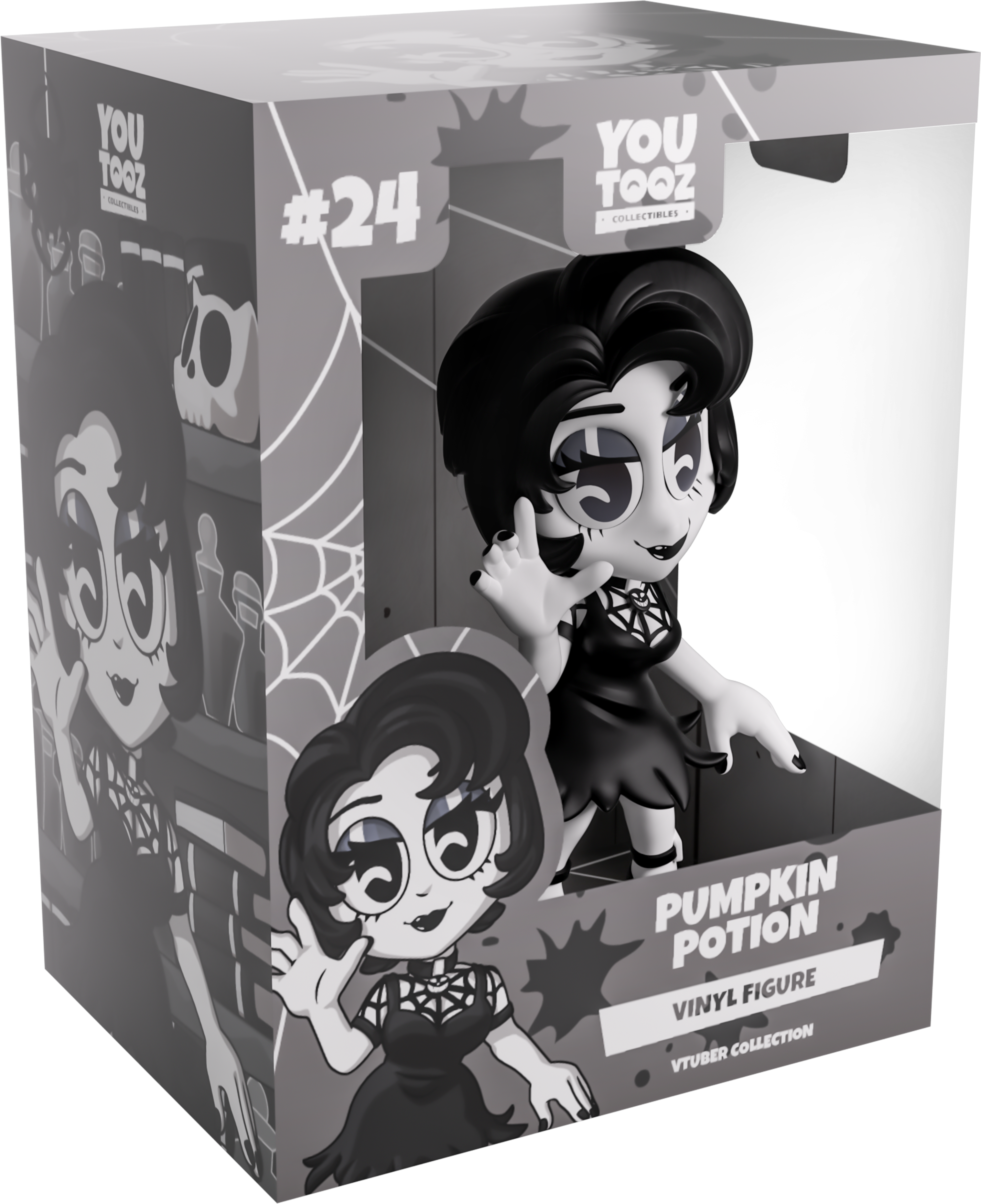 Pumpkin’s downed a new potion that has brought her into the modern era for her Youtooz debut! Standing at 4.6 inches tall with a hand raised to the front as her hip swishes to the side, a pair of huge grey eyes shine out from above a black-lipped smile as a bob of hair wraps around her head. Wearing a collared dress that has a spider web pattern over the chest and shoulders, the jagged ends around her thighs flick out to the sides as bare legs lead down to black platform shoes. The exterior of her packaging sees a roaring fireplace with a skull at its center and candles on the mantle, while the interior mimics shadowy walls with white cobwebs in the corners. This motif then makes its way onto the protective sleeve where her figure can be seen through the large clear window at the packaging’s front. This collectible ships in a matte, embossed, protective outer sleeve and a custom-sized plastic protector for maximum protection during shipping.