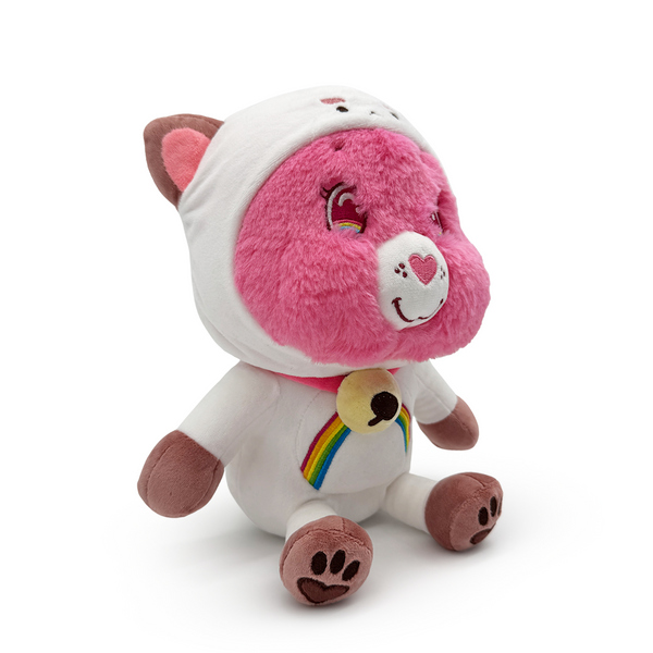Cheer Bear just got a new assignment from the Temp Bot and has put on their best PuppyCat costume to get things done! Sitting at 9 inches tall with a bright pink face poking out from the front of their PuppyCat costume, deep brown eyes look out from above a white muzzle that has a pink heart nose and a cheery smile. With PuppyCat’s always angry face on the forehead between two pointed brown ears, a pink collar wraps around their neck with a yellow bell hanging over the rainbow marking on their white stomach as brown feet kick forward, showing off heart paw pads. This plush is packed to the seams with 100% PP cotton and is made of the softest minky material, perfect for cuddling or being just plain adorable with!