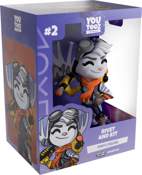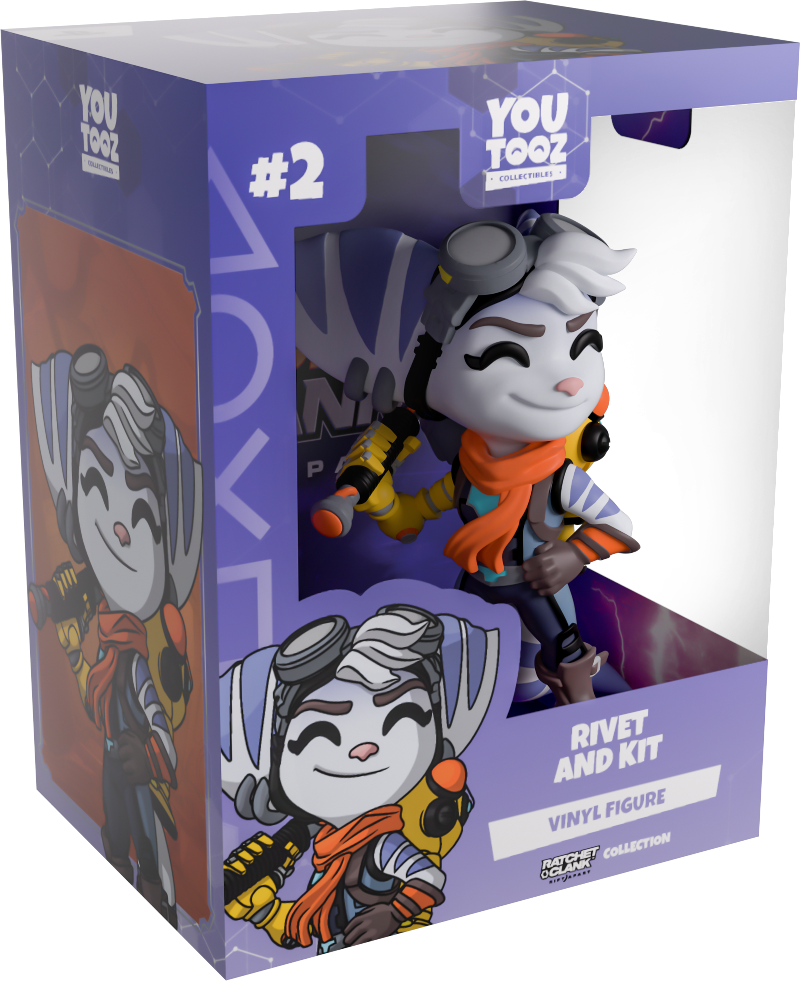Rivet’s finished exploring Clank’s dimension and has set her sights on Youtooz! Standing at 4.2 inches tall with a huge hammer slung over her right shoulder as she holds onto its hilt with a robotic yellow arm, a confident smile crosses her pale face as a pair of goggles are strapped over her head between a tuft of grey hair and long striped ears. With a long orange scarf flowing from her neck and wearing a two-tone grey suit with blue highlights and thick brown boots, strapped to her back above a thick tail is Kit who has glowing blue eyes and orange orbs on their yellow head. The exterior of their packaging sees the Rivet jumping out of a purple rift. While the interior is a spiralling white vortex that shoots strands of electricity over a deep purple background, the protective sleeve is a dark blue with a metal plate across the bottom, as their figures can be seen through the large clear window at the packaging’s front. This collectible ships in a matte, embossed, protective outer sleeve and a custom-sized plastic protector for maximum protection during shipping