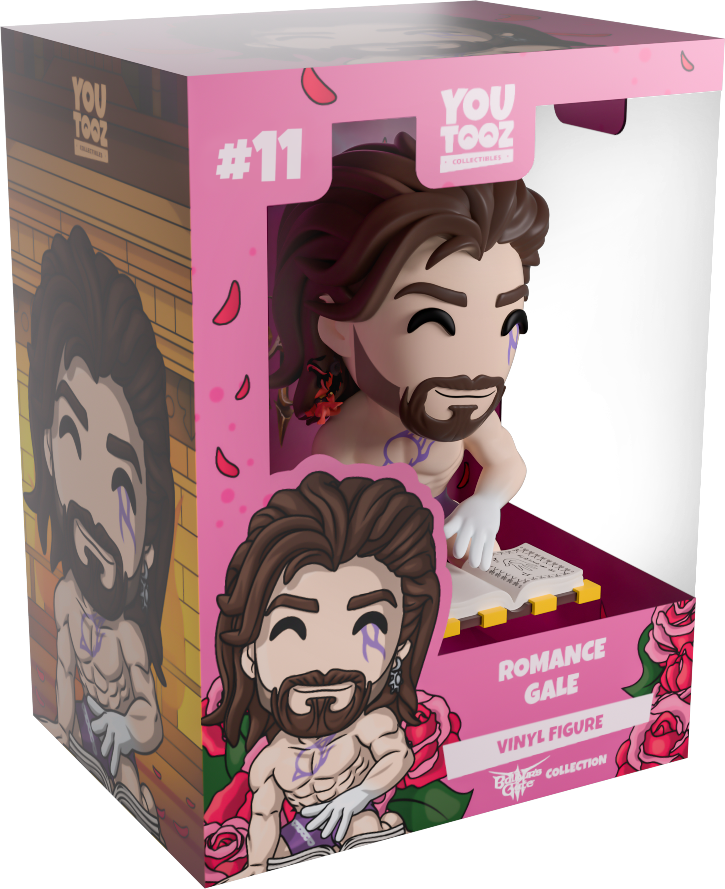 Kneeling in front of an open purple and yellow tome at 3.8 inches tall, his ghostly white hand flicks over the pages as a loving smile peeks through his thick brown beard, and long hair falls past his shoulders. With a purple marking on his left cheek under kind eyes that matches the one on his muscular chest, he wears nothing but tight purple shorts as a silver earring hangs from his left ear. The exterior of his packaging sees him in front of a warm fireplace, while the interior is covered in floating red petals over a pink background. These then flow onto the protective sleeve, where his figure can be seen through the large, clear window at the packaging’s front. This collectible ships in a matte, embossed, protective outer sleeve and a custom sized plastic protector for maximum protection during shipping.