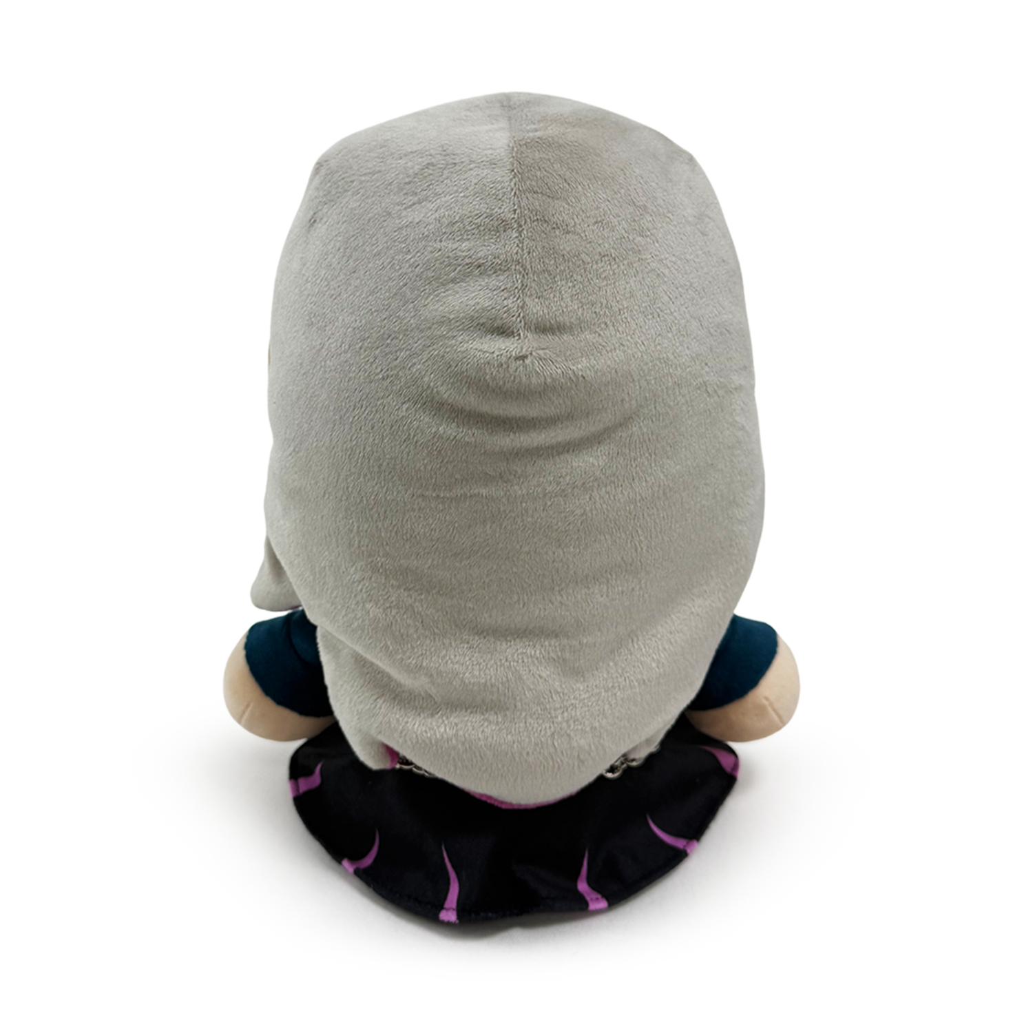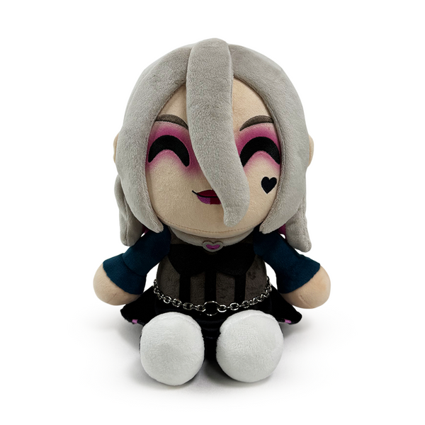 Wandering from the shadowy cemetery and back into Youtooz, Sable’s returned to make her plush debut! Sitting at 9 inches tall with grey and pink hair falling over her pale face and down past her shoulders, thick lips curl into a smile under shadowy pink eyes as black love heart marks her left cheek. With a pink and grey heart choker around her neck and dark grey and black bodice, her sleeves are a dark blue as a chain wraps around her waist above a black and pink skirt, and her white shoes kick forward. This plush is packed to the seams with 100% PP cotton and is made of the softest minky material with accents of felt, absolutely perfect for cuddling or surviving with!