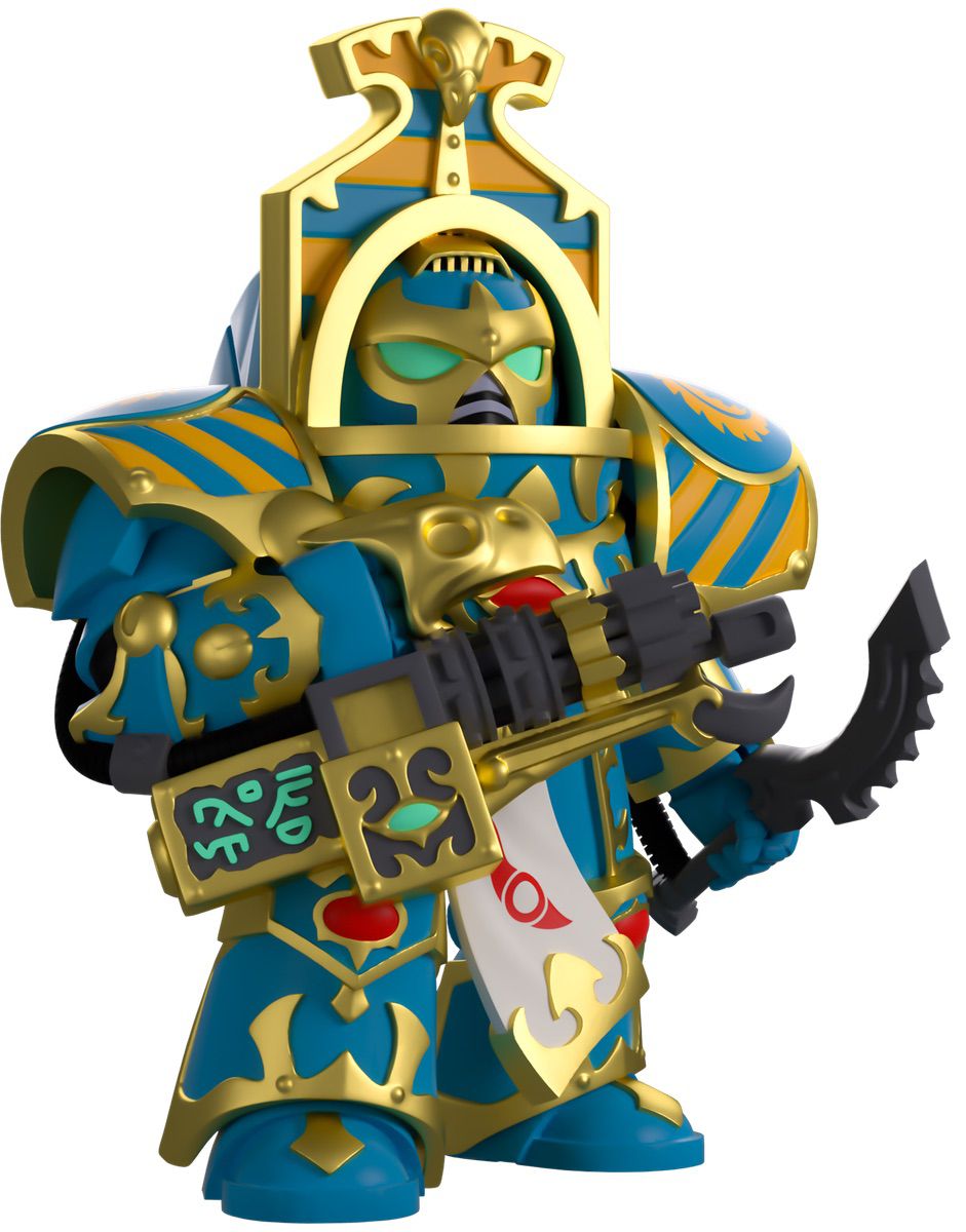 The Scarab Occult Terminator has blasted their way into Youtooz and is sure to leave no survivors! Standing at 5.5 inches tall and raising a huge Soulreaper Cannon to their front as they prepare to launch a volley of devastating armour-piercing rounds, in their left hand, they grip a Prosperine Khopesh at the ready for anyone who dares get too close. With thick, ornate gold-trimmed blue armour covering their whole body that has red markings on the knees and chest, along with a white tabard flowing from their waist, teal eyes stare out from their round helmet as they lock onto their next foe! The exterior of their packaging sees him inside a golden arch, while the dark blue interior has gold lines around the border. This then continues onto the white and black protective sleeve, where his figure can be seen through the large, clear window at the packaging’s front. This collectible ships in a matte, embossed, protective outer sleeve and a custom-sized plastic protector for maximum protection during shipping
