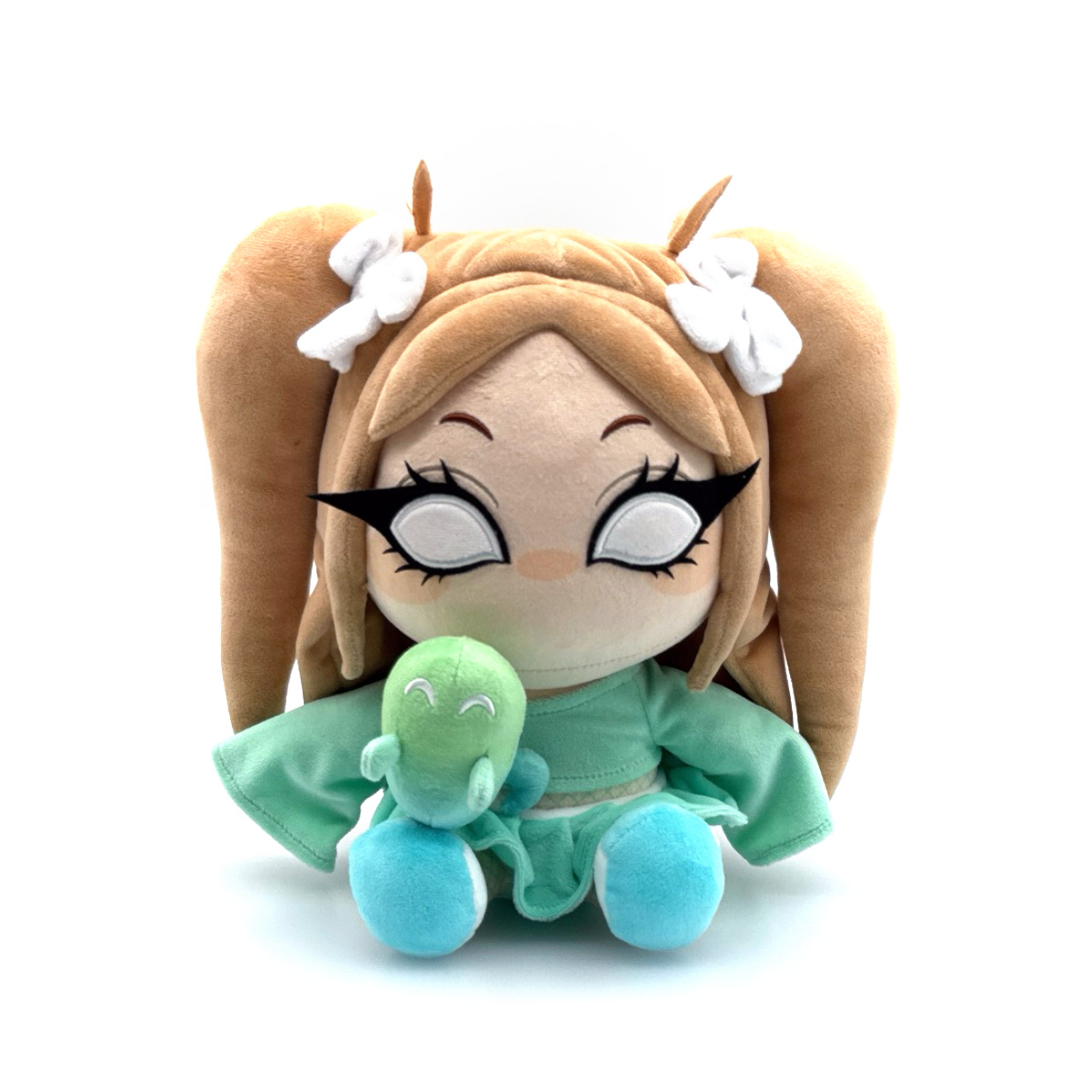 Hey Seekers, your looking has come to an end because Seekme has made her Youtooz plush debut! Sitting at 9 inches tall with her legs kicked forward and wearing teal shoes with white socks and fishnet leggings that lead up to a soft mint pleated skirt, her cropped pastel green sweater has sleeves that hang over her hands as an adorable green ghost friend sits in her lap. With peachy blonde hair styled in a pair of pigtails that are held in place by white bows, the rest falls down her back as a parted fringe frames her all-white eyes. This plush is packed to the seams with 100% PP cotton and is made of the softest minky material with accents of felt, perfect for cuddling or serving looks in Roblox with!