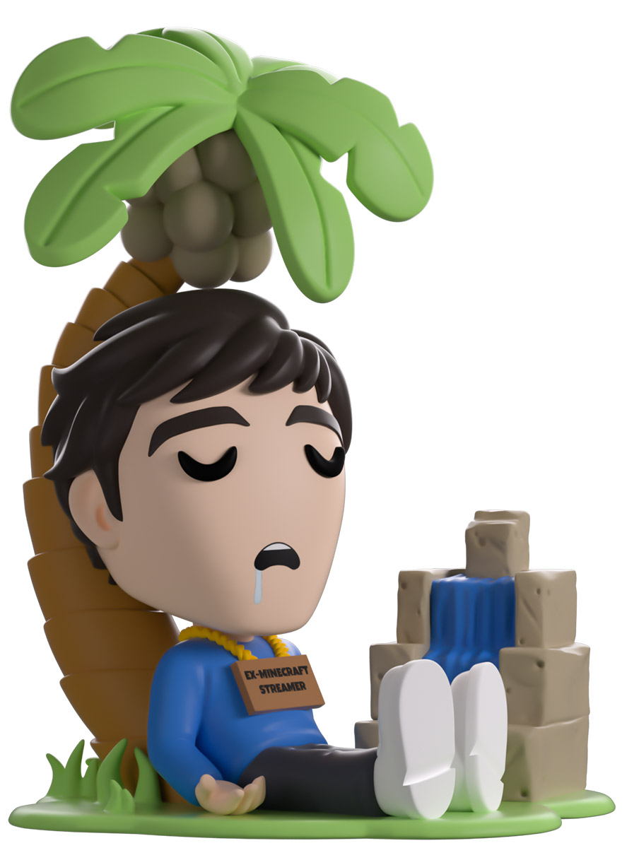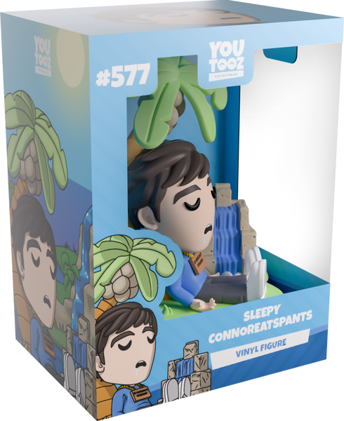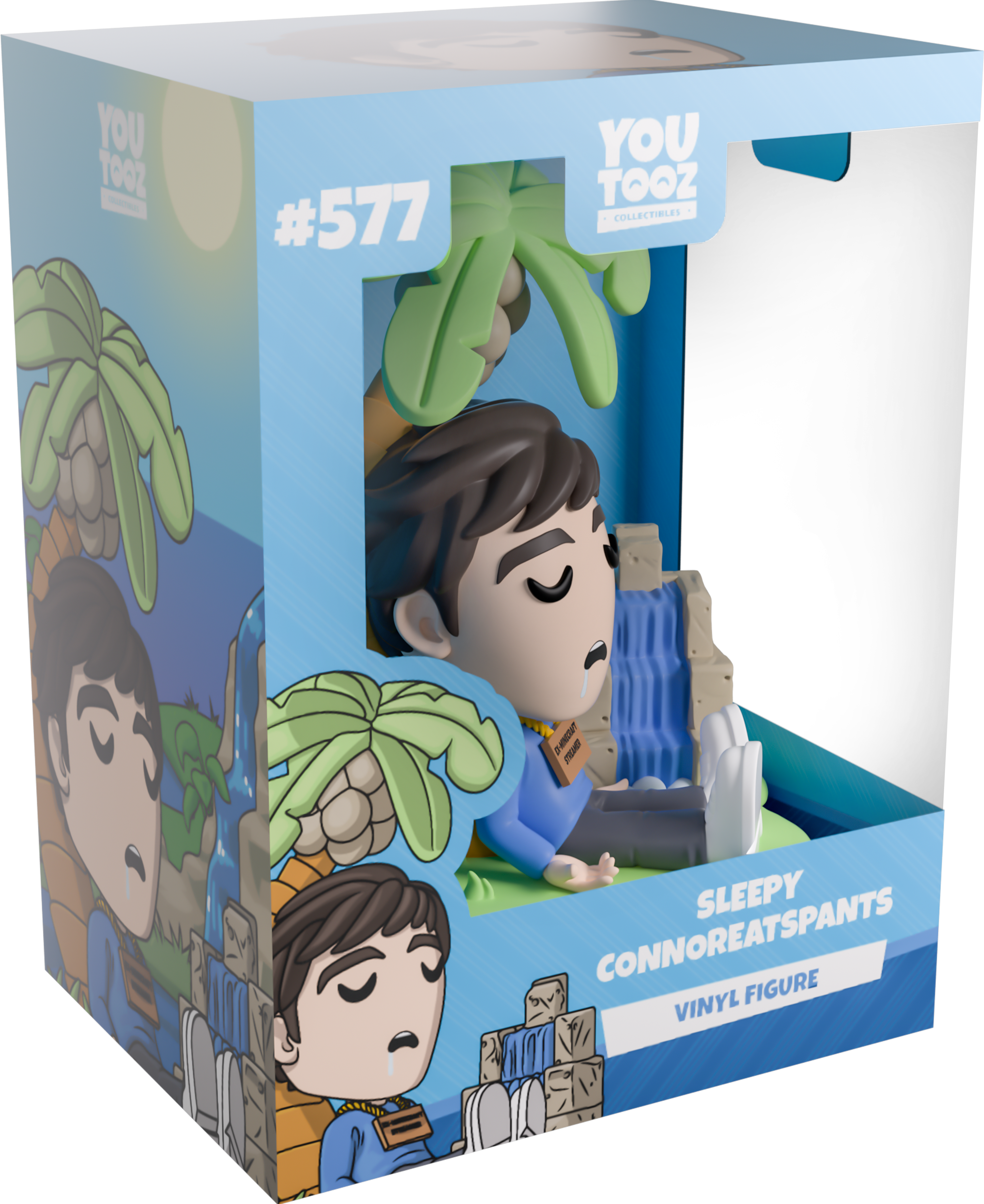 Shhh, you'll wake him! Connor is back and we're letting him rest up with his return to Youtooz! At 5.1 inches tall, Connor rests calmly against the base of a Coconut tree fast asleep with snot bubbling from his nose and a trail of drool from his open mouth. With a small waterfall gurgling next to this sleeping streamer, he's is accessorized with white sneakers and a gold chained board with the phrase "Ex-Minecraft streamer" printed on it. The exterior of his packaging showcases a serene waterfall scene, while the interior is a multi-toned blue striped design. The protective sleeve is illustrated with lush green grass and flowers as his figure can be seen through the large clear window at its front. This collectible ships in a matte, embossed, protective outer sleeve and a custom-sized plastic protector for maximum protection during shipping.