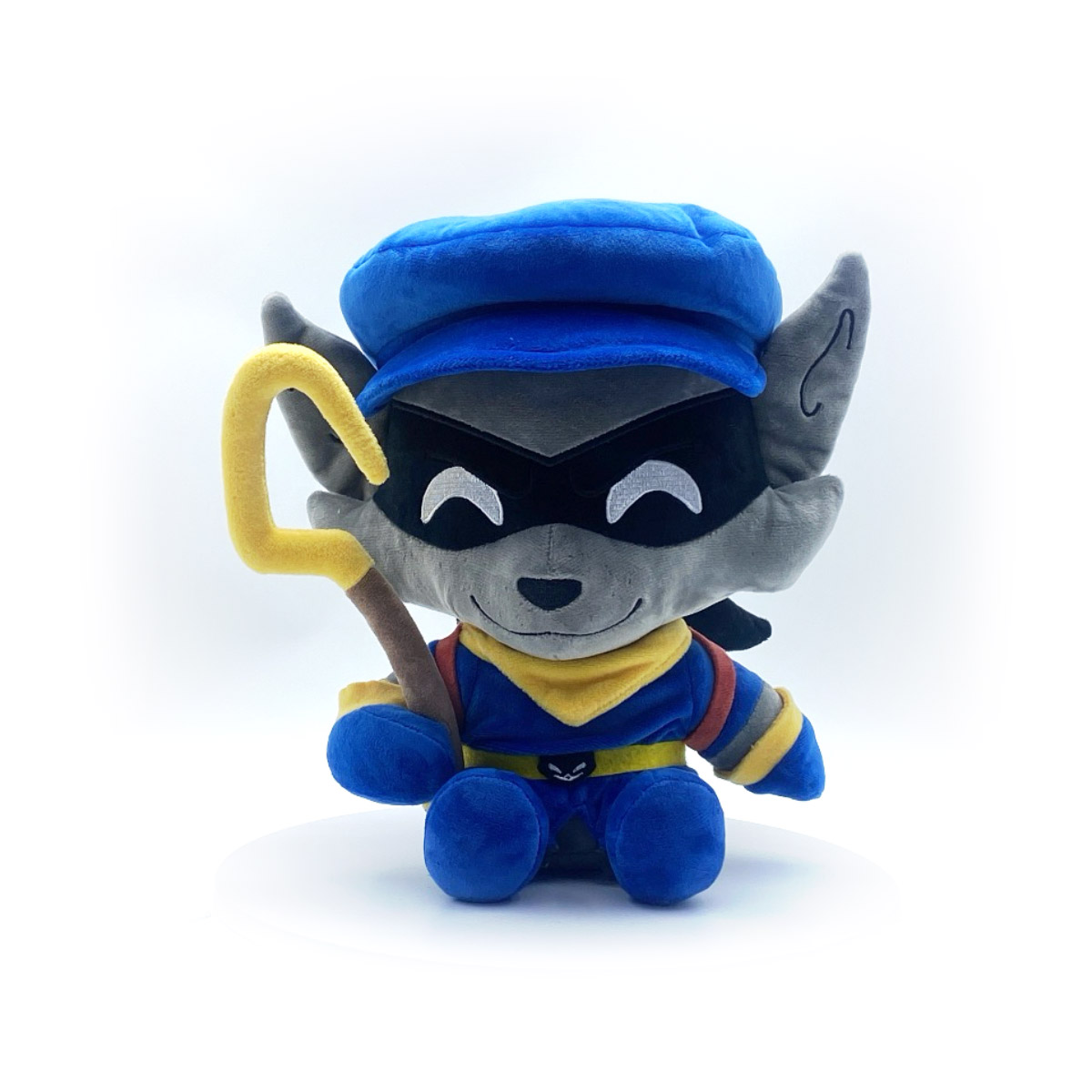 Sly’s returned to Youtooz in search of the missing pages from the Thievius Raccoonus! Sitting at 9 inches tall with a black mask covering his eyes and a cheeky smile crossing his grey muzzle, a blue cap rests atop his head as a red backpack full of treasure is slung over his shoulders. Holding a long cane with a yellow hook in his right hand, he wears a bandana around his neck that matches the cuffs of his gloves as a thick striped tail pokes out from the back of his blue jacket. This plush is packed to the seams with 100% PP cotton and is made of the softest minky material with accents of felt, absolutely perfect for cuddling or doing some thieving with!