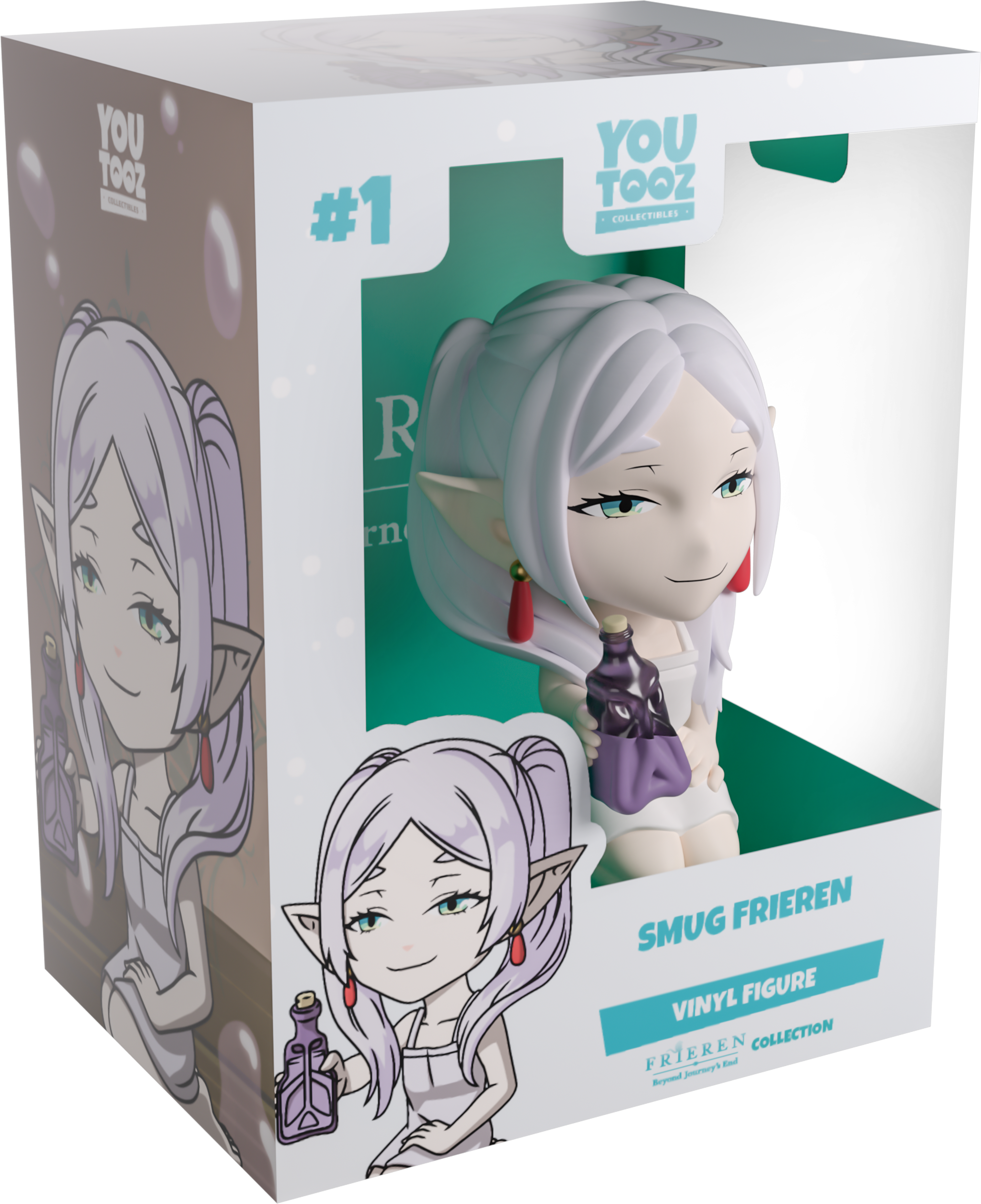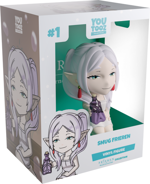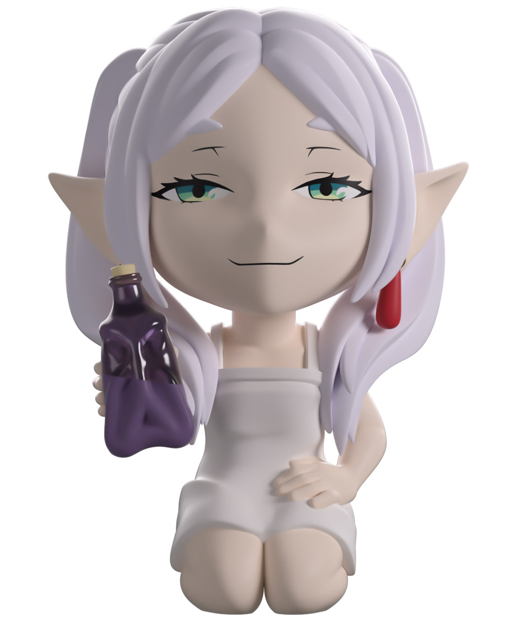 Frieren really knows how to let off some steam, and she’s joined Youtooz for a nightcap with her new vinyl figure! Kneeling at 3.4 inches tall and holding a half-filled purple potion bottle in her outstretched right hand, a smug, thin smile crosses her pale face underneath squinting green eyes. With her long white hair parted in the middle to hang in front of pointed ears, while two ponytails rest on her bare shoulders, she wears a simple white dress that cuts off just above her knees. The exterior of her packaging sees a purple bottle cast on the wooden floor with droplets flying out of it, while the interior is covered in a calm teal gradient. The protective sleeve is then a soft grey with white dots making their way over its front as her figure can be seen through the large, clear window at the packaging’s front. This collectible ships in a matte, embossed, protective outer sleeve and a custom-sized plastic protector for maximum protection during shipping.