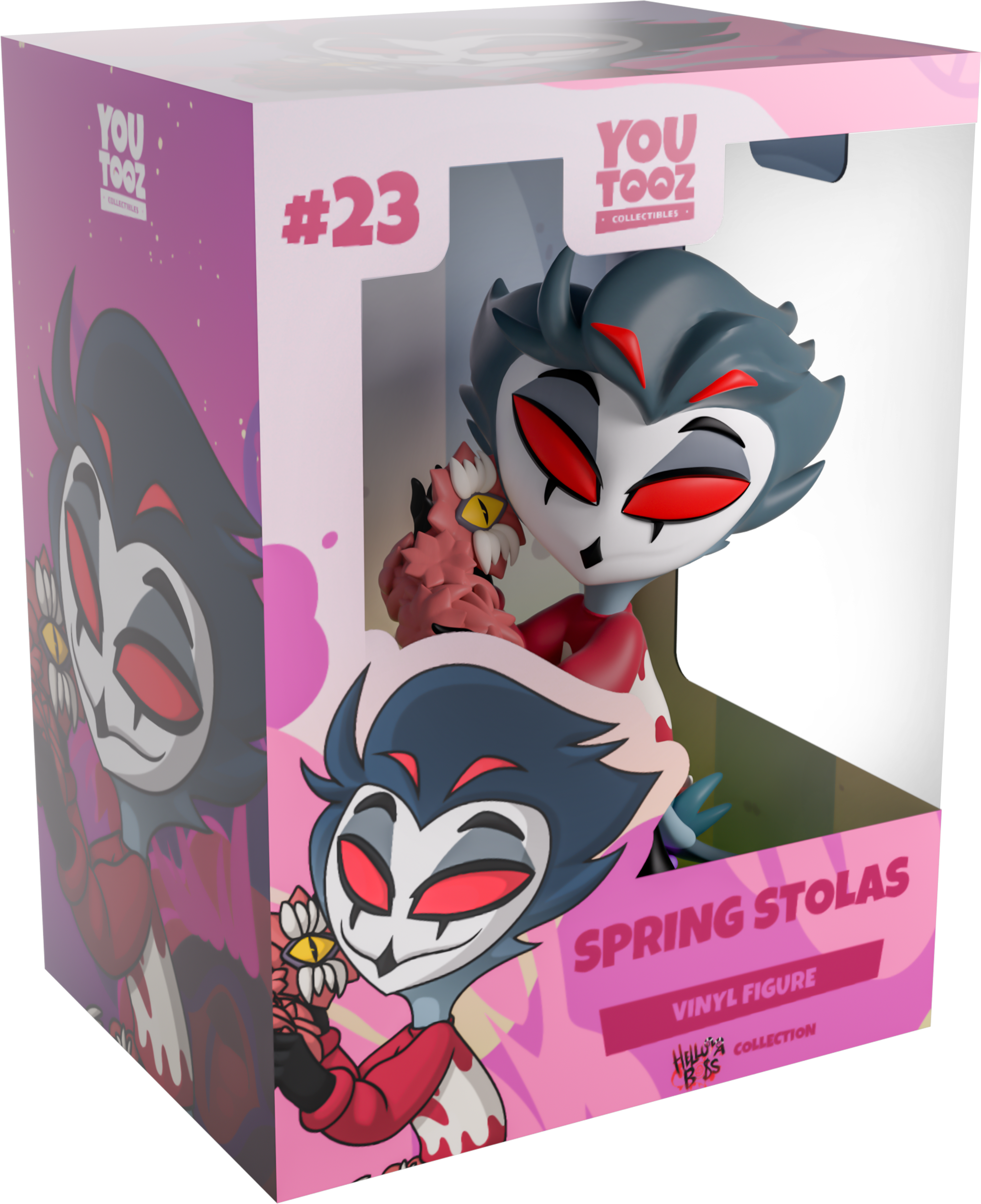It’s springtime in Hell, and Stolas is taking full advantage of the growing season to show off his freshly bloomed (and totally safe) flowers! Standing at 4.8 inches tall, as he proudly holds a freshly picked bunch of vibrant red carnivorous flowers that have an open yellow eye at the center between rows of sharp teeth, a smug look crosses his white face under shadowy red eyes as long hair sweeps back effortlessly from his head. Wearing a red sweater that has a cream colored pattern around the torso, along with purple pants, a cluster of red and purple flowers of Hell bloom behind his long tail. The exterior of his packaging sees a bunch of carnivorous flowers under a hazy purple sky, while the interior is filled with pale blue and green stripes with a light splatter over the top. The protective sleeve is then covered with a floral motif and diagonal striped lines as his figure can be seen through the large clear window at the packaging’s front. This collectible ships in a matte, embossed, protective outer sleeve and a custom-sized plastic protector for maximum protection during shipping.