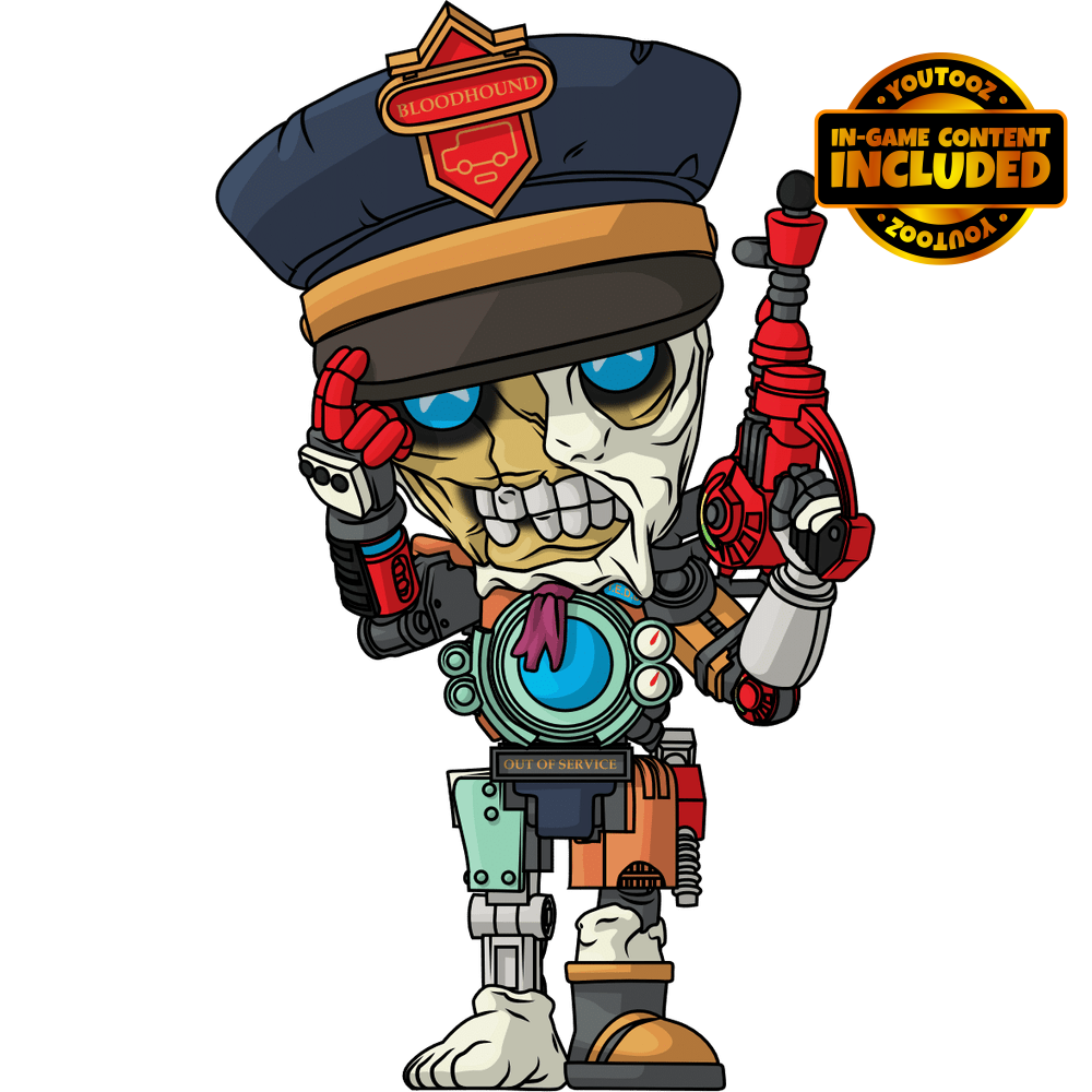 All aboard! T.E.D.D.’s arrived at Youtooz to give you the ride of your life!... Or death! Standing at 5 5 inches tall and tipping his Bloodhound service hat forward as he grips the brim with bright red fingers, synthetic skin peels off his face to reveal a broken smile and bright blue eyes in hollow sockets, along with a trio of switches on the back of his head. Raising a Ray gun in his right hand, his body has been pieced together with an amalgamation of mechanical parts as a teal portal covers his chest and a large grey booster is attached to his back. The exterior of his packaging is covered in a grey hexagonal pattern with bright orange highlights, while the interior is filled with a warping dark camouflage. The hexagons then continue onto the protective sleeve that has a grainy vertical blue and orange stripes, as his figure can be seen through the large, clear window at the packaging’s front. This collectible ships in a matte, embossed, protective outer sleeve and a custom-sized plastic protector for maximum protection during shipping.