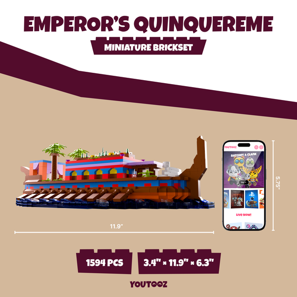 So get ready to sail into your newly conquered territory, one block at a time, with this expertly crafted brickset of The Emperor’s Quinquireme from Anno 117! Gliding effortlessly through clear blue seas with a series of oars extending from either side of its long brown hull that raises into a point at the front, a vast banquet lays outstretched above the colorful red blue and purple structure at its middle as luscious green plants and trees line either side and the Emperor’s lavish tent looks out from the back. Consisting of 1,594 pieces and measuring in at 3.4" × 11.9" × 6.3" with an expertly written instruction booklet to help you build your very own piece of the Roman Empire, this brickset is the perfect addition to your Anno collection or to let everyone know who’s the greatest Emperor!