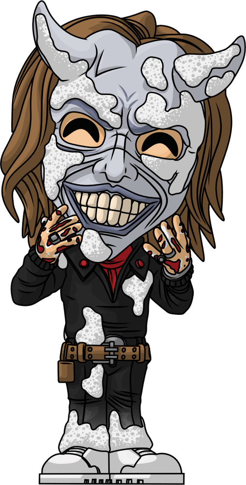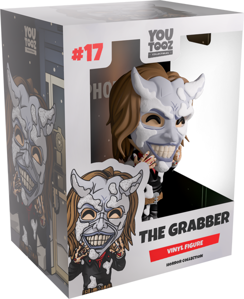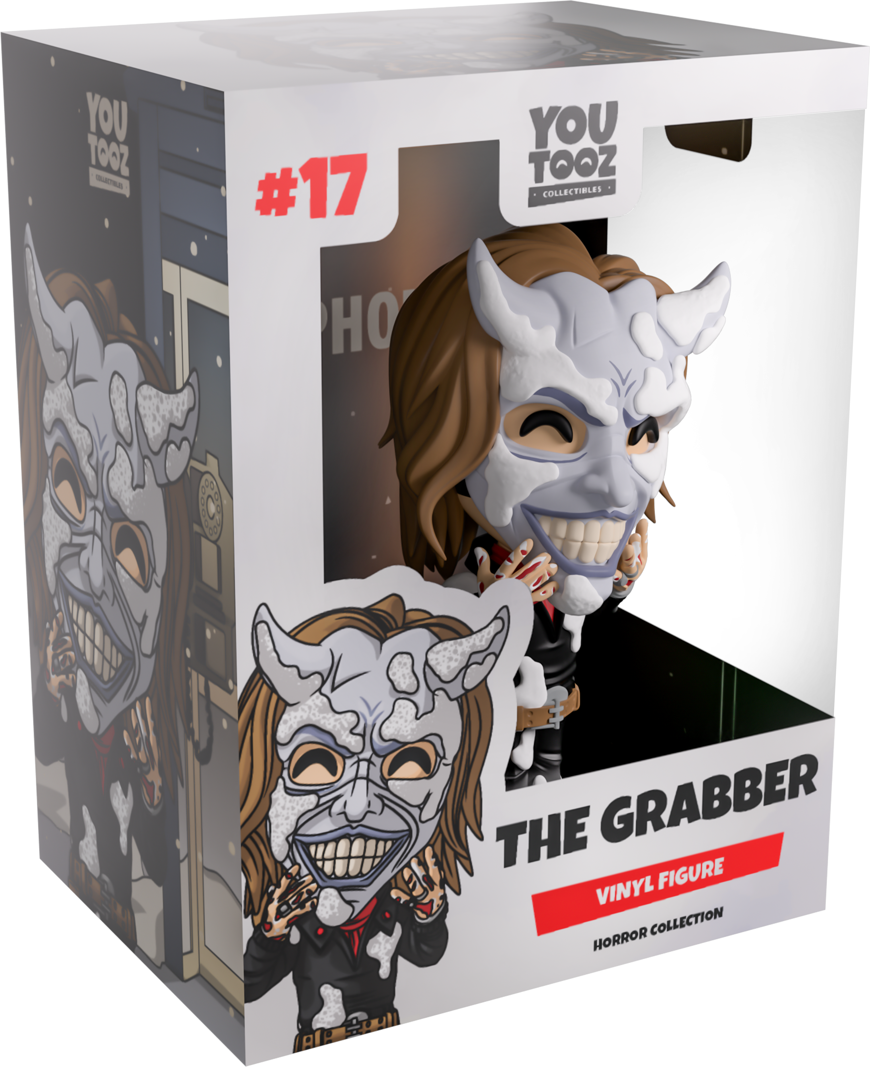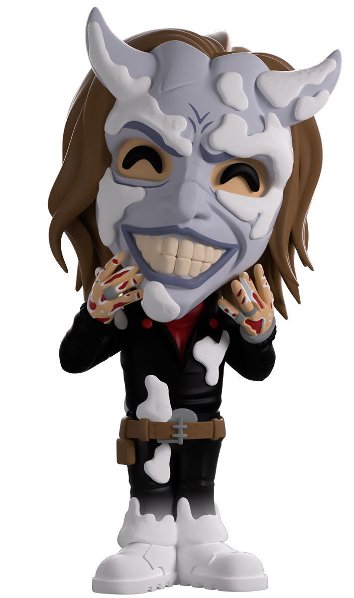 Why’s that phone ringing? Should we answer it? I’m sure nothing bad could come from it… Right?? Standing at 4.9 inches tall with shredded hands that are covered in deep red gashes held to their front, long brown shaggy hair falls from his head behind the horrifying smiling mask that has thick horns strapped over his face. Wearing black jeans and a jacket which has red buttons on the lapel that match the turtleneck sweater underneath, thick white snow hangs from his mask and shirt as it clings to thick boots and the cuffs of his pants. The exterior of his packaging sees a lone illuminated phone booth glowing against a snowy field. While the black interior is covered in a light film grain, this then continues onto the exterior, where his figure can be seen through the large, clear window at the packaging’s front. This collectible ships in a matte, embossed, protective outer sleeve and a custom-sized plastic protector for maximum protection during shipping.