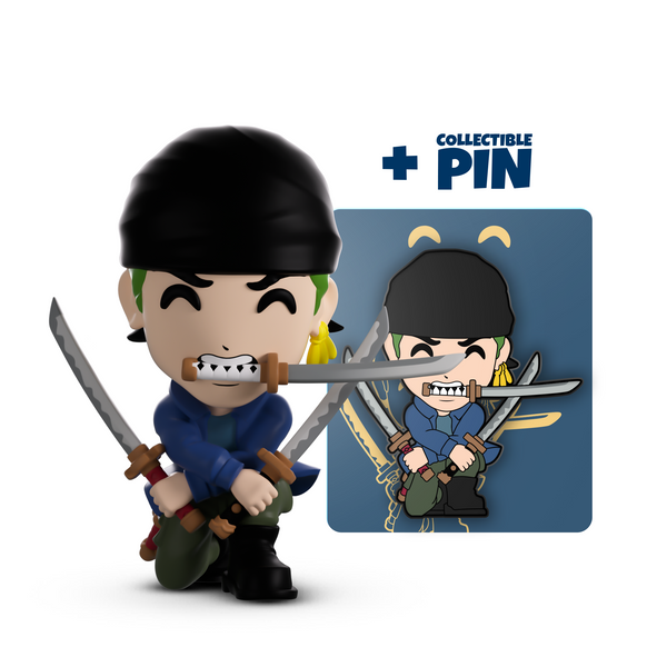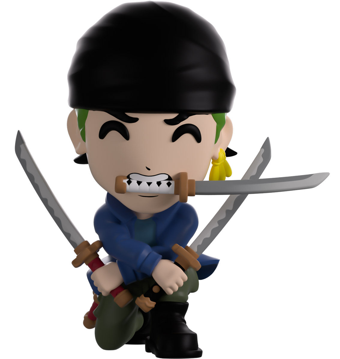 What’s better than one sword? Two swords of course! Wait, Three Swords?! Now that’s just insane! Kneeling down at 3.9 inches tall as he prepares to lunge forward with a series of viscous slashes, Zoro’s arms cross over his body as he holds a katana in each hand, along with a third gripped between his teeth. With determined eyes and wearing a black bandana over short green hair, the hem of his dark blue jacket swishes around his waist over dark green cargo pants, which are tucked into black boots. The exterior of his packaging sees him crouching in a dimly lit room. While the interior sees a vibrant blue crashing wave sending white sea foam skywards in front of a beautiful pale yellow background, this design then flows onto the protective sleeve where his figure can be seen through the large, clear display window at its front. This collectible ships in a matte, embossed, protective outer sleeve and a custom-sized plastic protector for maximum protection during shipping.