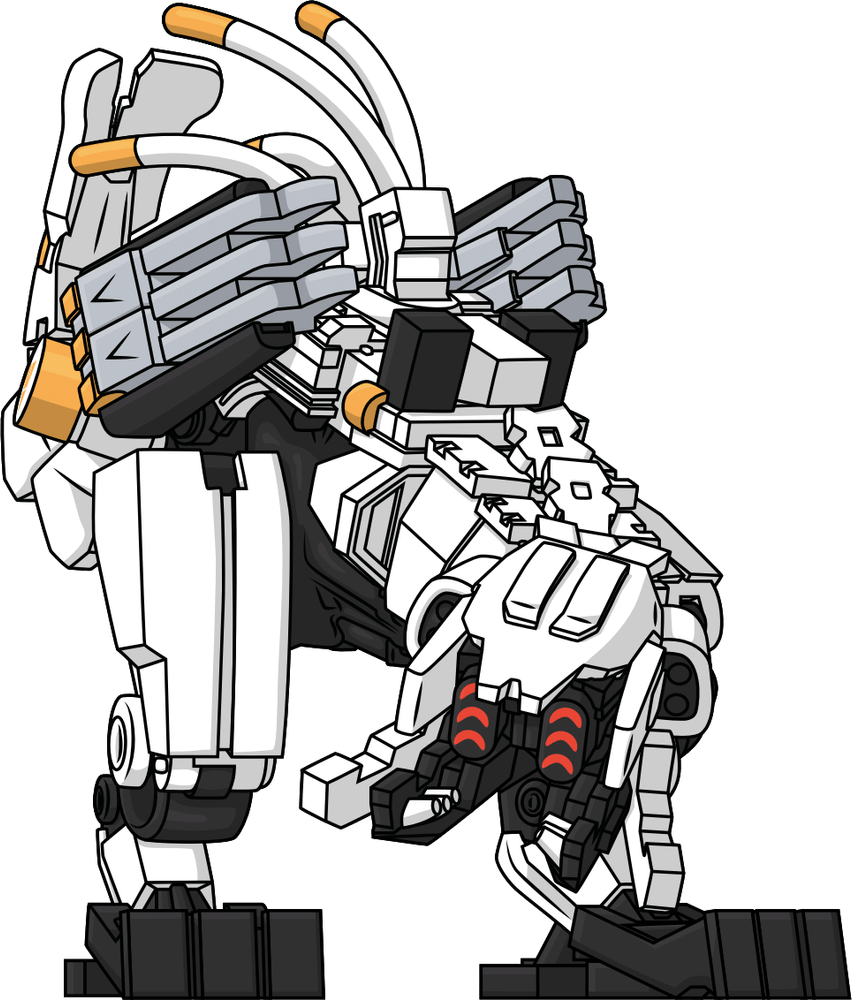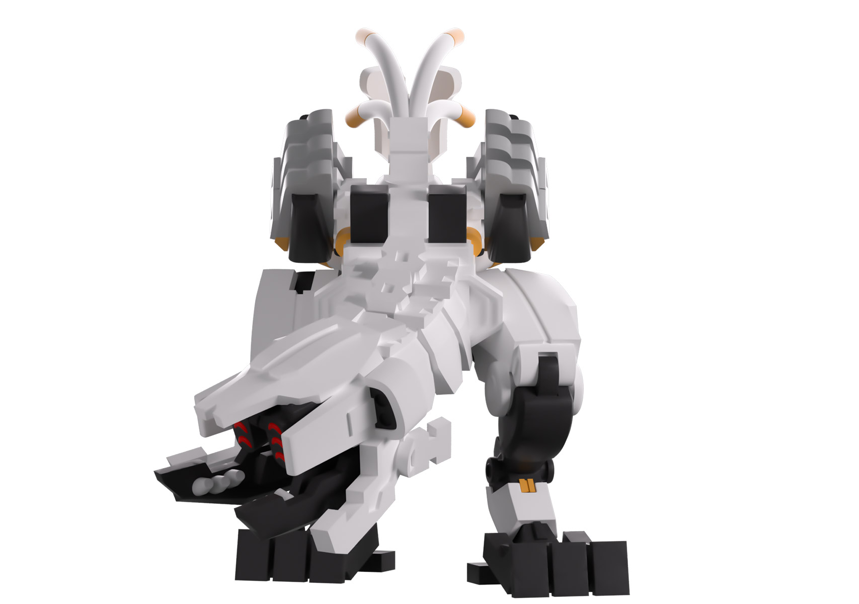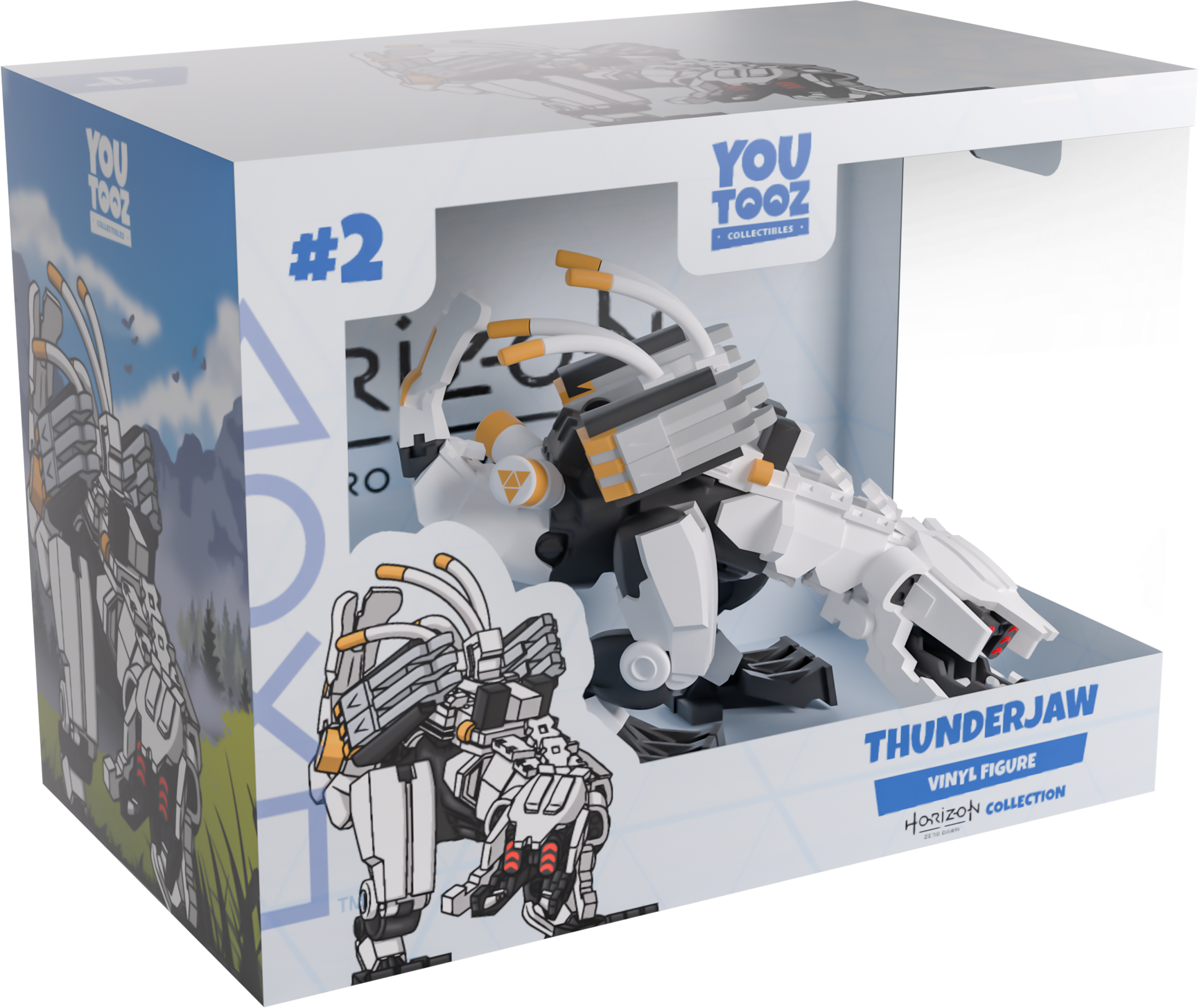 Is that a Thunderjaw?! Quick, hide! Oh no, it spotted us! Leaning forward at 4 inches tall and whipping their head around to focus on its prey with 6 red optical sensors, a toothy split jaw parts to either side of their mouth, which is always prepared to unleash a devastating laser. With sturdy white armor covering their body in thick segments, a radar array rests on its back above a pair of disk launchers as a thick tail flicks upwards and sturdy legs keep them upright. The exterior of their packaging sees them standing over a jagged cliff with tall mountains in the background, while the interior is covered in a pale blue triangular pattern. The protective sleeve then looks out onto rolling green plains as clouds dance through a blue sky and their figure can be seen through the large clear window at the packaging’s front. This collectible ships in a matte, embossed, protective outer sleeve and a custom-sized plastic protector for maximum protection during shipping.