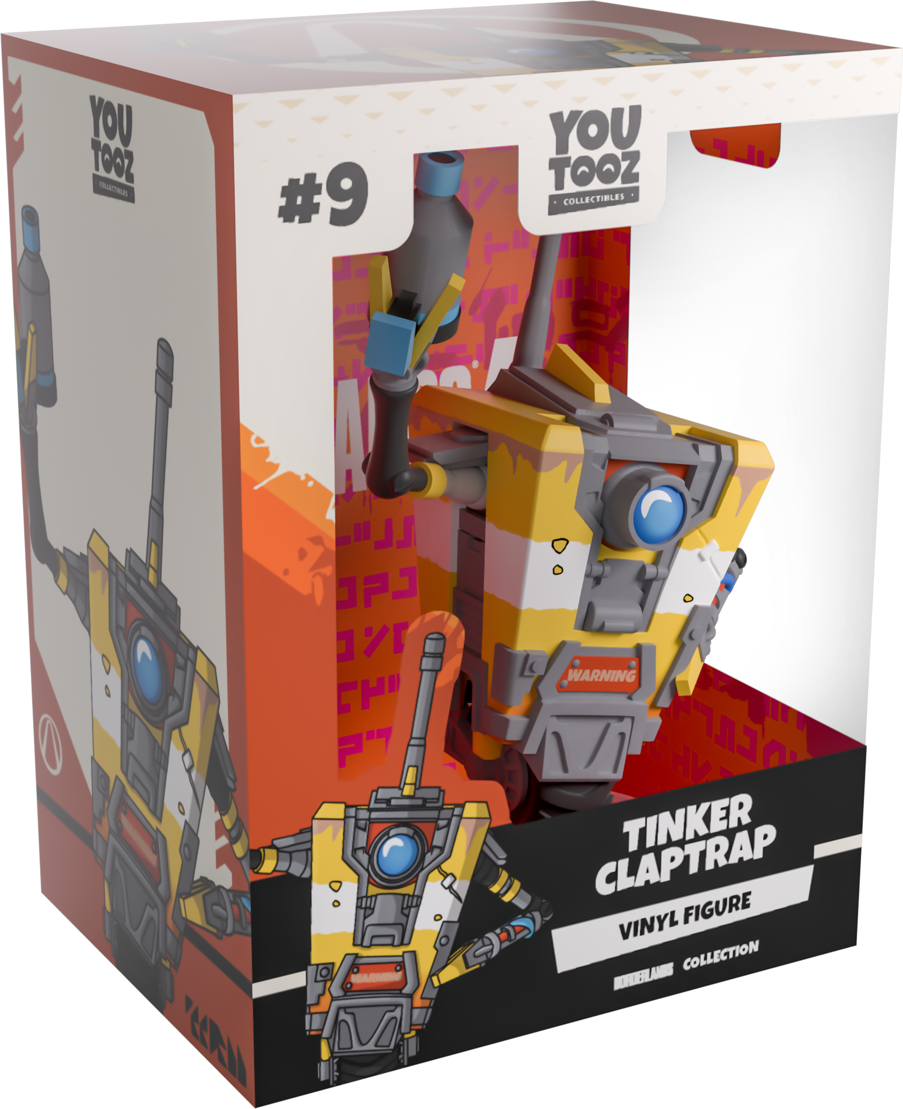 He may be a member of the resistance, but Claptrap didn’t resist getting another Youtooz! At 5.2 inches tall, as he thrusts a rivet gun in the air while the other clamped hand rests on his side, a long antenna reaches out from the top of their blocky body underneath a large blue ‘eye’. Propped up on a thick tire as they tilt to the side, a white line runs through their yellow body as strains drip from the top, and a ‘warning’ sign flashed across his front. The exterior of his beige packaging has deep orange lines running through it diagonally, while the interior is covered in strings of blocky pink code. The protective sleeve then continues the same earthy oranges through its middle as his figure can be seen through the large clear window at the packaging’s front. This collectible ships in a matte, embossed, protective outer sleeve and a custom-sized plastic protector for maximum protection during shipping.
