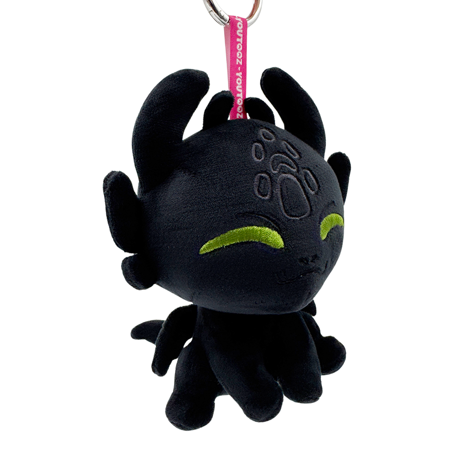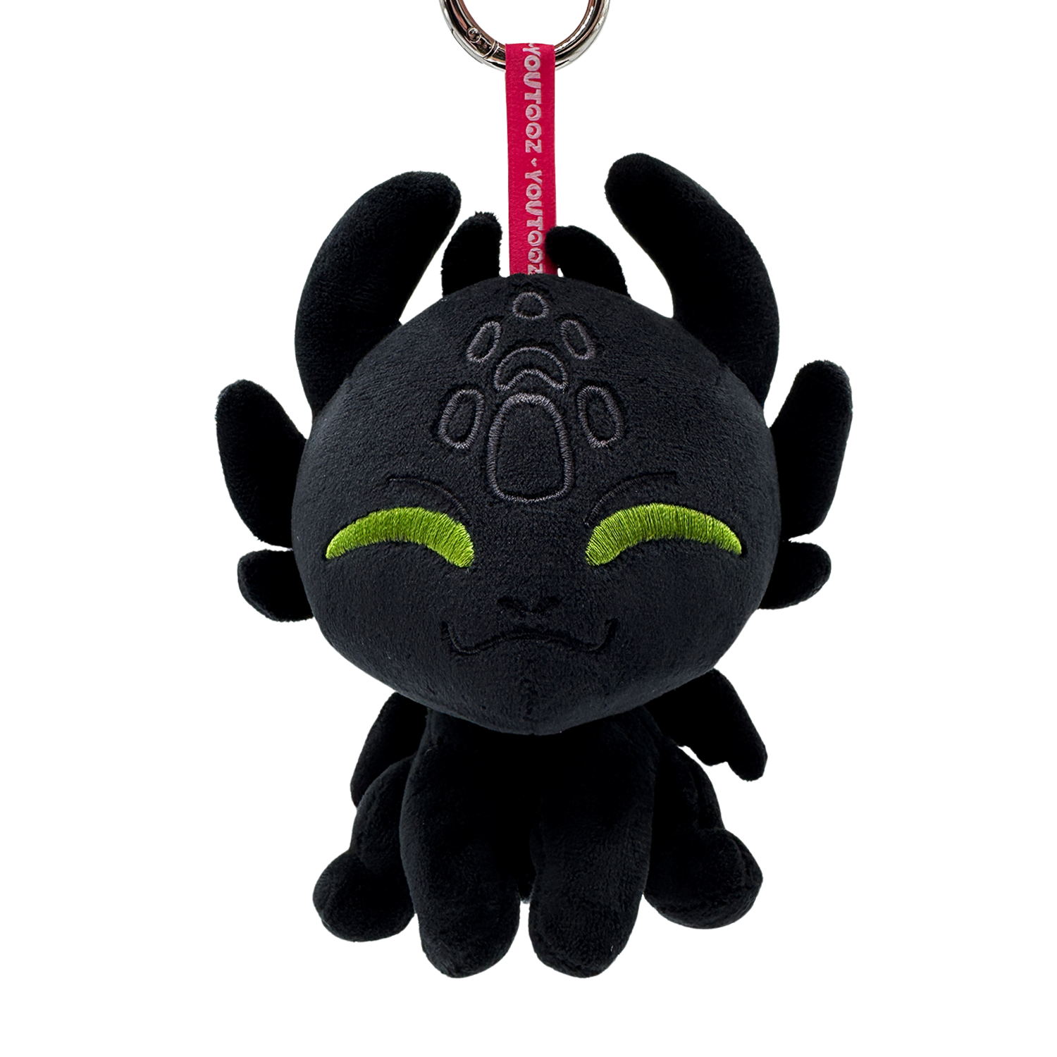 Toothless has returned to Youtooz and is ready to follow you around wherever you go with our brand new keychain! Sitting at 5.5 inches tall with a pair of thin green eyes shining out from a smiling black face, as long ears poke out from the top of his head, front paws keep him upright as small wings protrude from his shoulders, complete with a long red and black tail that sticks out from the back. This keychain is packed to the seams with 100% PP cotton and is made of the softest minky material with a keyring attached to the top by a pink Youtooz tag, absolutely perfect to hang from your backpack, purse, pants or wherever you want to show off that dragons are friends!