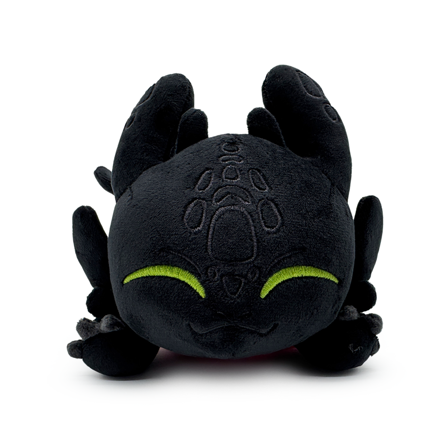 Now it's Toothless's turn to ride you with our brand new plush! Laying down at 6 inches long as they look out playfully with bright green eyes and just the cutest smile as a pair of thick ears point backwards, his arms and legs are flung out lazily as small scales pattern their black forehead and lead into spines that run down their back to a red and black tail while a pair of wings poke out from their shoulders. This plushie is made of the softest minky material, is packed to the seams with the most huggable squishy 100% PP cotton and comes equipped with a magnetic disc to let it perch firmly atop your shoulder as the best accessory while racing on your dragon!
