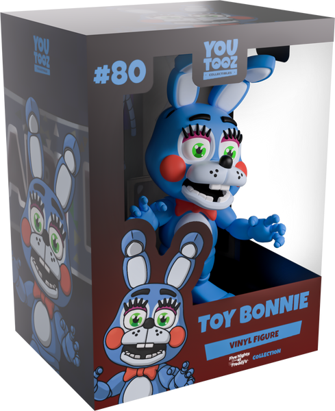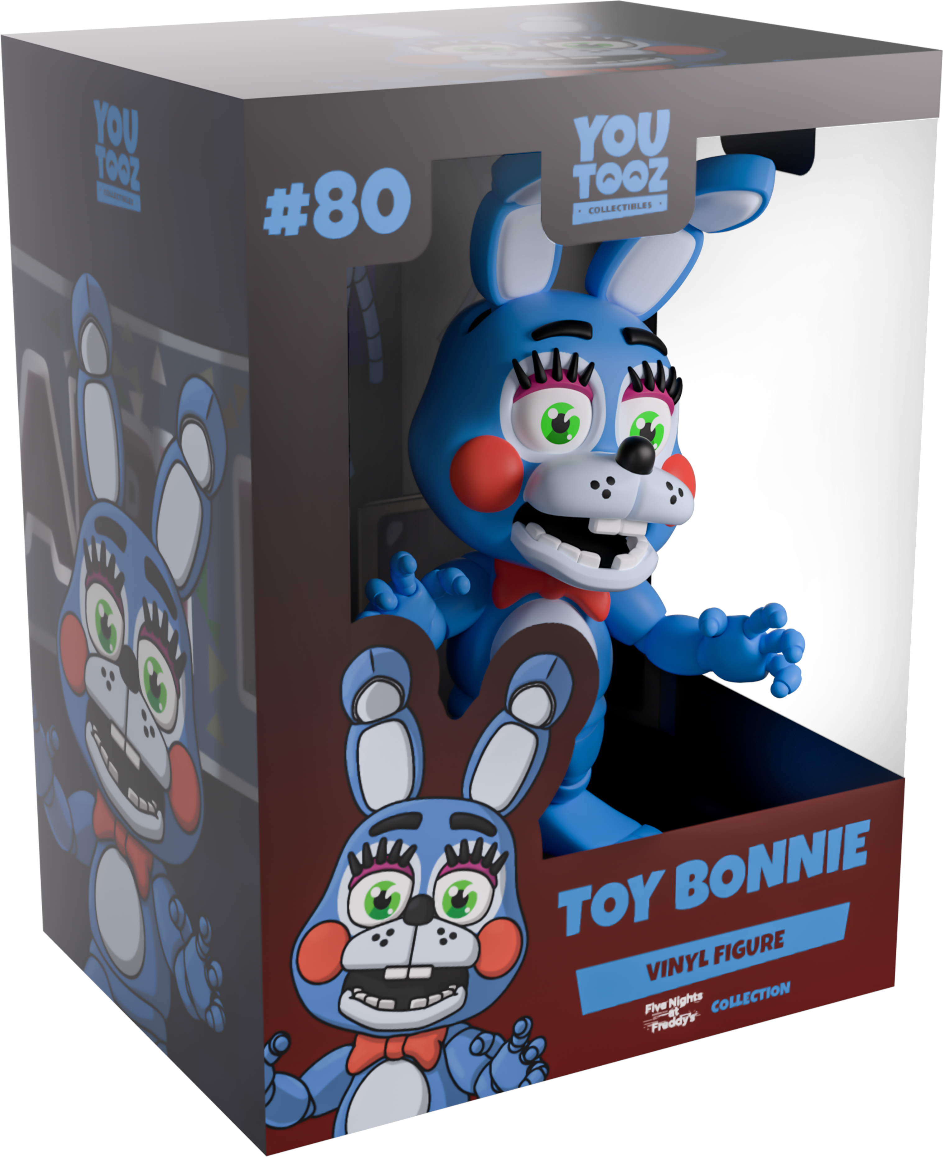 Clear the stage! The real star of the show has arrived at Youtooz! Standing at 5.3 inches tall with his hands outstretched and a pair of bright green pupils shining out from lashed eyes, two long ears curve forward from the top of his head above bright red cheeks. With buck teeth hanging from his open grey muzzle, a red bowtie rests on his neck above a light grey stomach which matches his small round tail as segmented arms and legs connect to the blue torso of his suit. The exterior of their packaging sees half of Freddy’s head resting atop a television with a close-up of their face on the screen, while the interior looks into a dark room with a checkered floor as old monitors are stacked in the background. The protective sleeve is then covered in vertical blue and black stripes with thick wires dangling from the top and their figure can be seen through the large clear window at the packaging’s front. This collectible ships in a matte, embossed, protective outer sleeve and a custom-sized plastic protector for maximum protection during shipping.