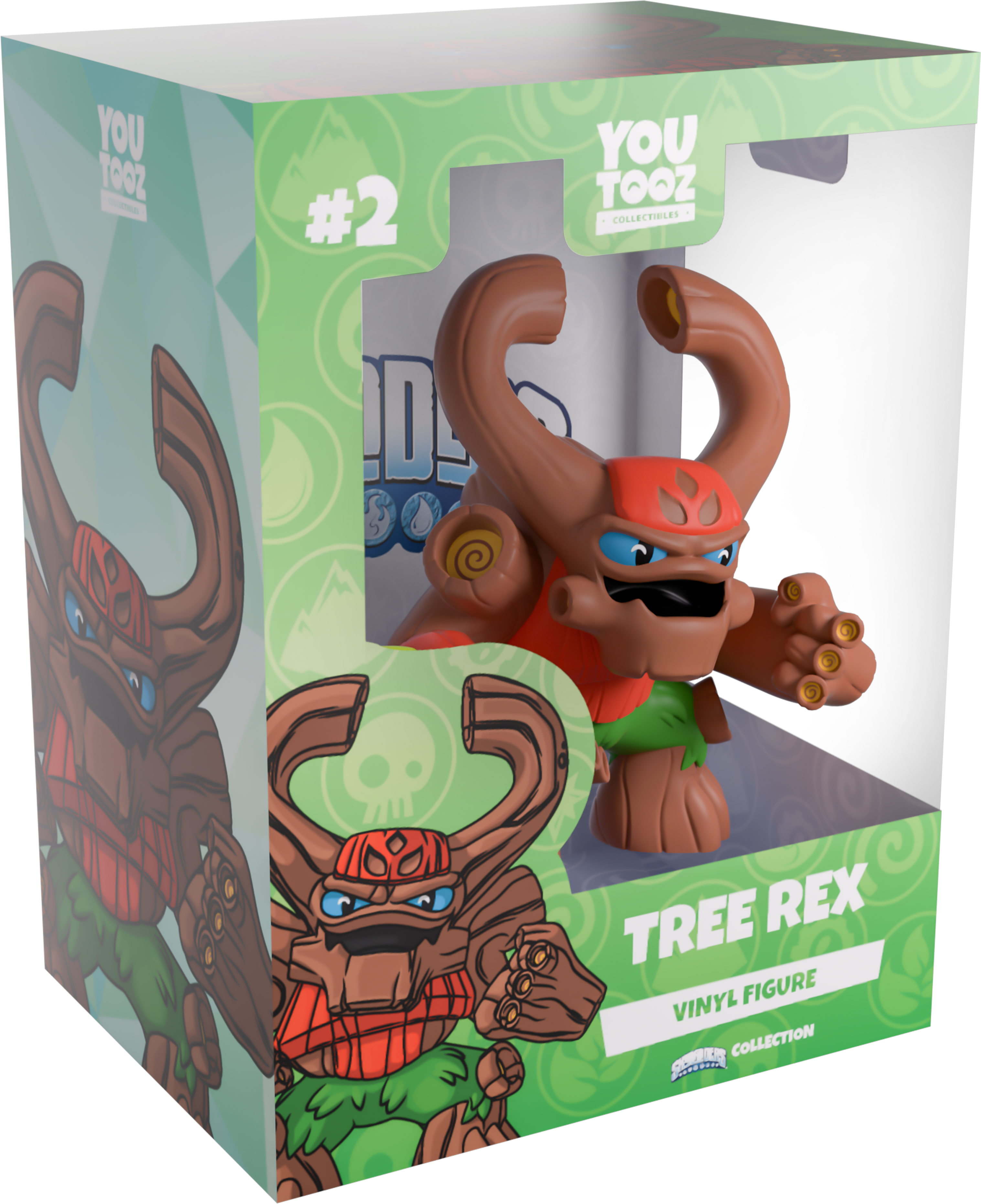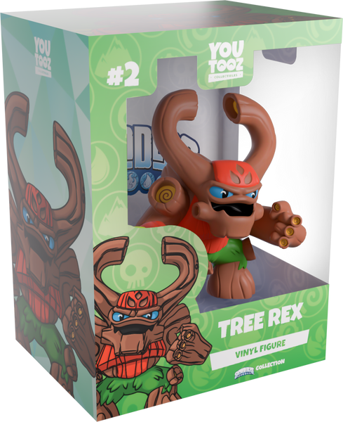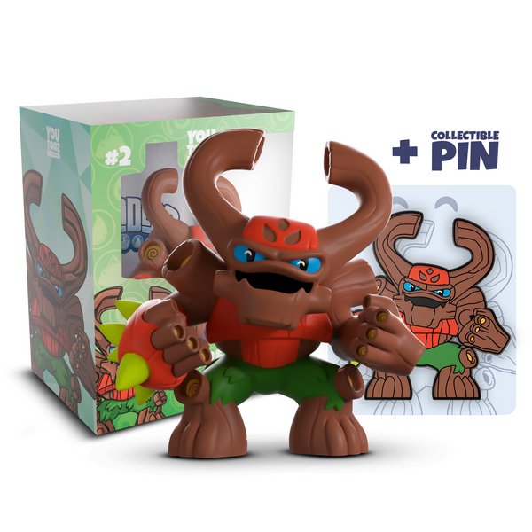 You wouldn’t be ‘bark’ing up the wrong tree if you thought Tree Rex was going to get their very own Youtooz! Standing at 4.2 inches tall with his brown wooden jaw opening up into a deep smile, furrowed blue eyes look out from underneath an orange headpiece as a pair of thick horns curl inwards. With sturdy trunks extending from each joint and the center of his back, his left arm is a spiky green and orange cannon as green foliage covers his waist. The exterior of his packaging sees him atop a tree as thorny vines whip out from its base, and a jagged green triangle pattern fills the background. The light interior is then covered in white circles that show off the different elements, this design then continues onto the protective sleeve, where his figure can be seen through the large, clear window at the packaging’s front. This collectible ships in a matte, embossed, protective outer sleeve and a custom-sized plastic protector for maximum protection during shipping.