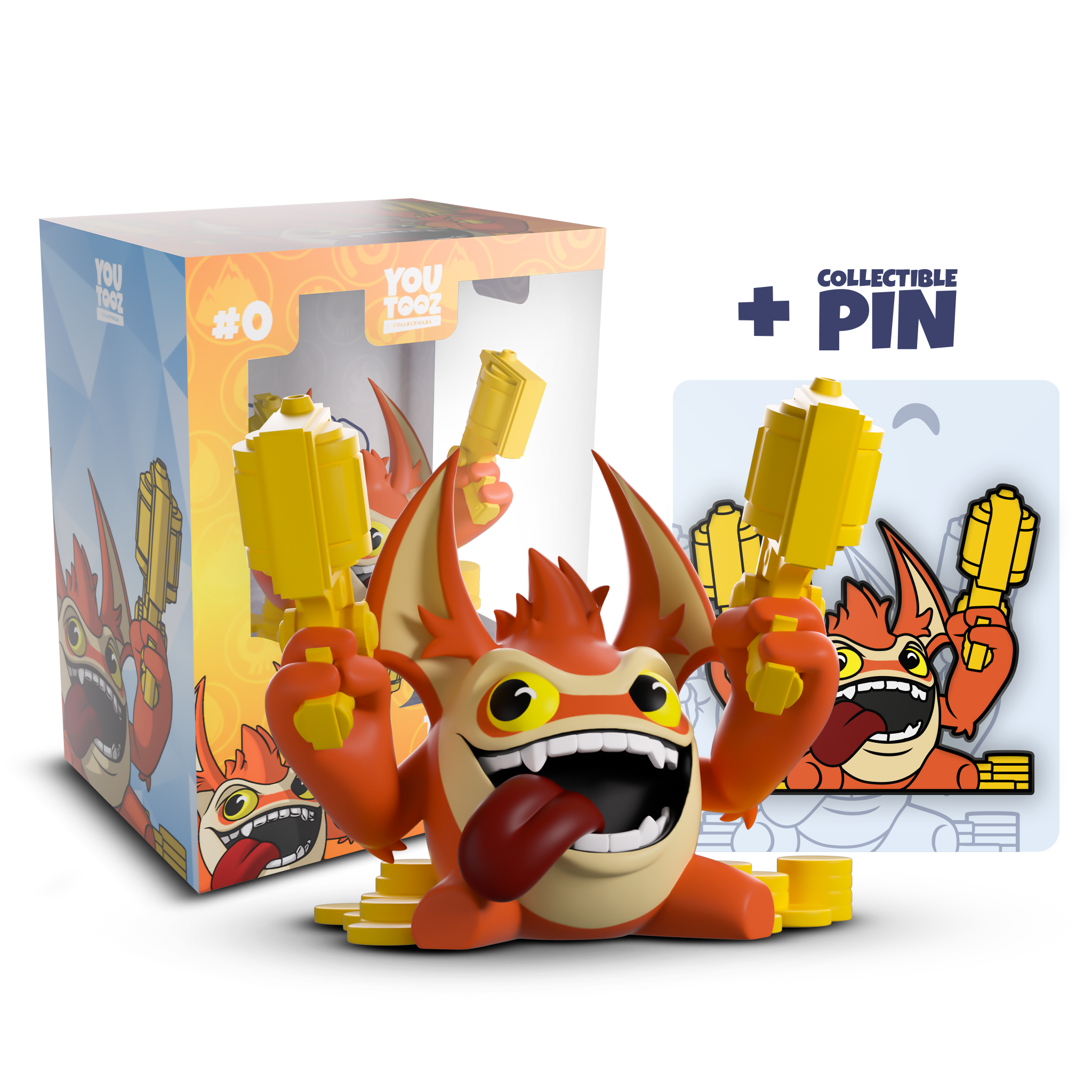 Hide the gold! Trigger Happy is here! Sitting against a pile of gold coins at 3.4 inches tall, as he throws up a pair of huge pistols to point towards the sky, a long red tongue hangs from his toothy open mouth as he glances to the side with bright yellow eyes. With a thick brow topping his pale face as a tuft of pair flicks up between two long jagged ears, short thick legs poke out from the base of his round body. The exterior of his packaging sees him nestled in a huge pile of coins as a jagged blue triangle pattern fills the background. The light interior is then covered in white circles that show off the different elements, this design then continues onto the protective sleeve, where his figure can be seen through the large, clear window at the packaging’s front. This collectible ships in a matte, embossed, protective outer sleeve and a custom-sized plastic protector for maximum protection during shipping.