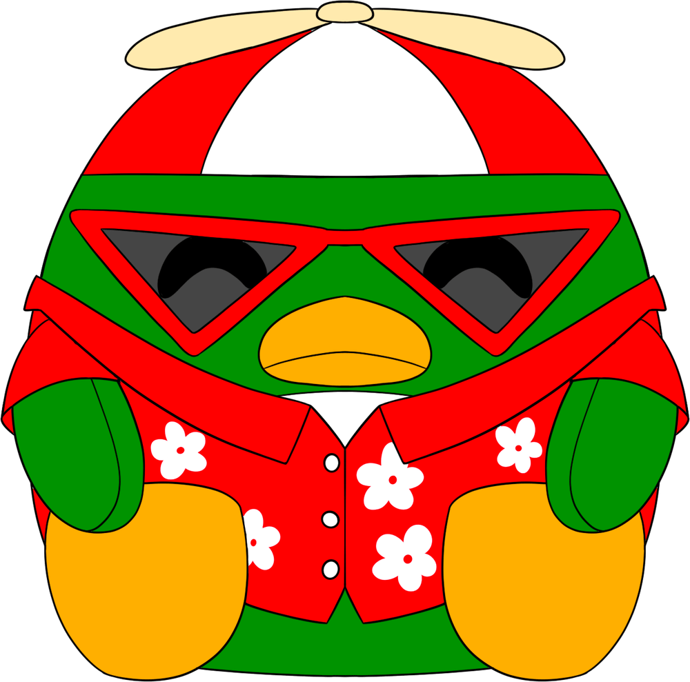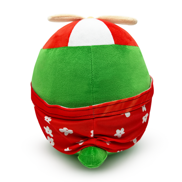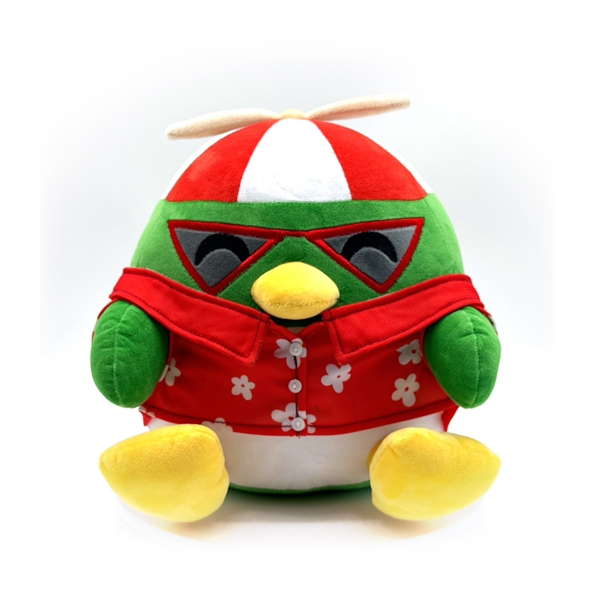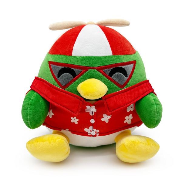 Don't forget your passport, cuz bestie we are heading to the airport for a vacay! Isaacwhy is back but only as a pitstop layover on his way for a vacation! Sitting at 9 inches tall, this hot weather hunting penguin has his yellow flippers kicked forward while he wears a red Hawaiian shirt that's covered in a white flower pattern. With his green wings relaxing at his sides and his beak in a slight frown, triangular red-trimmed shades cover his eyes as his iconic red and white helicopter hat sits atop his head. This plush is packed to the seams with 100% PP cotton and is made of a mix of minky and tricot materials with accents of felt and pvc material, perfect for cuddling or getting away with!