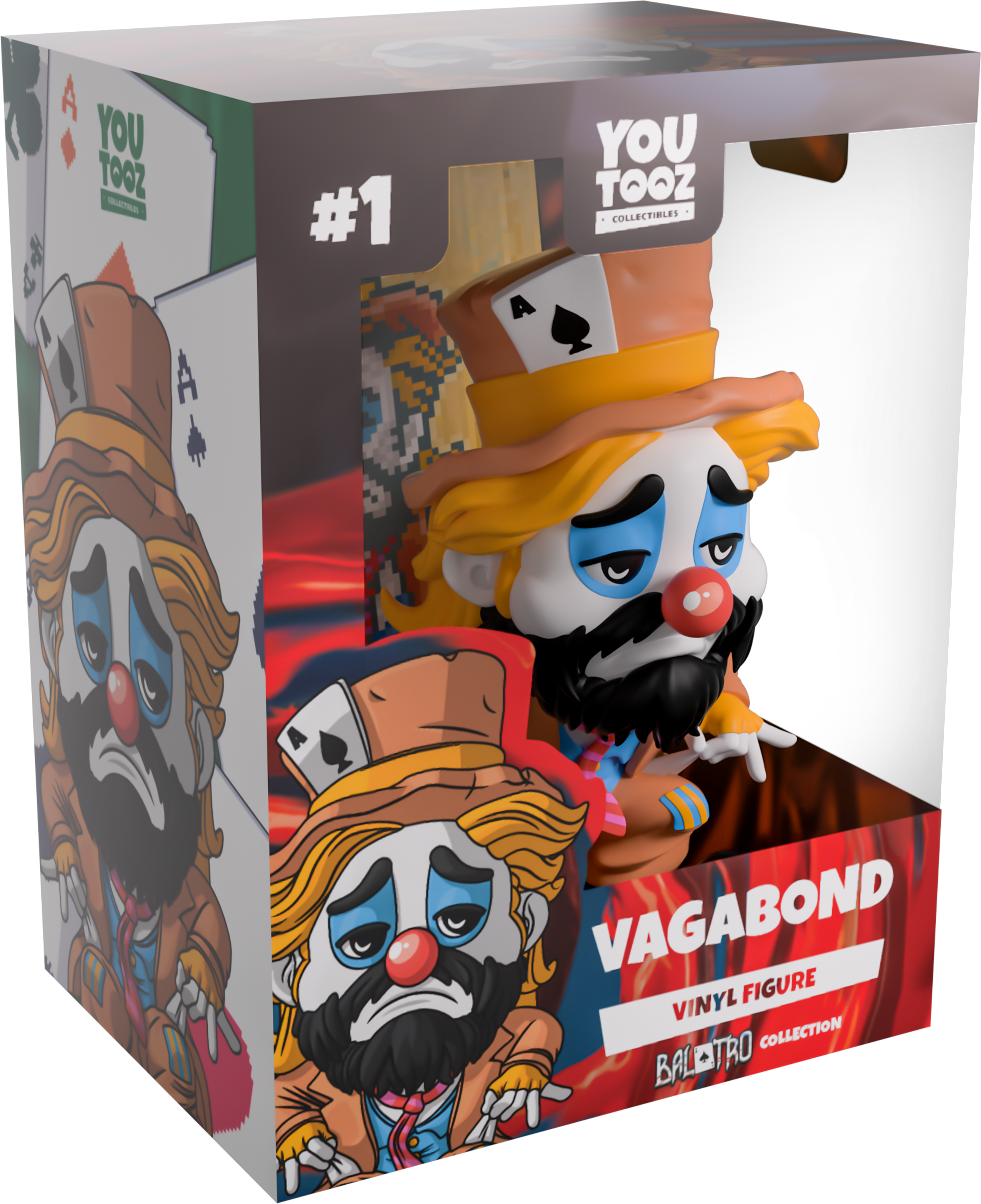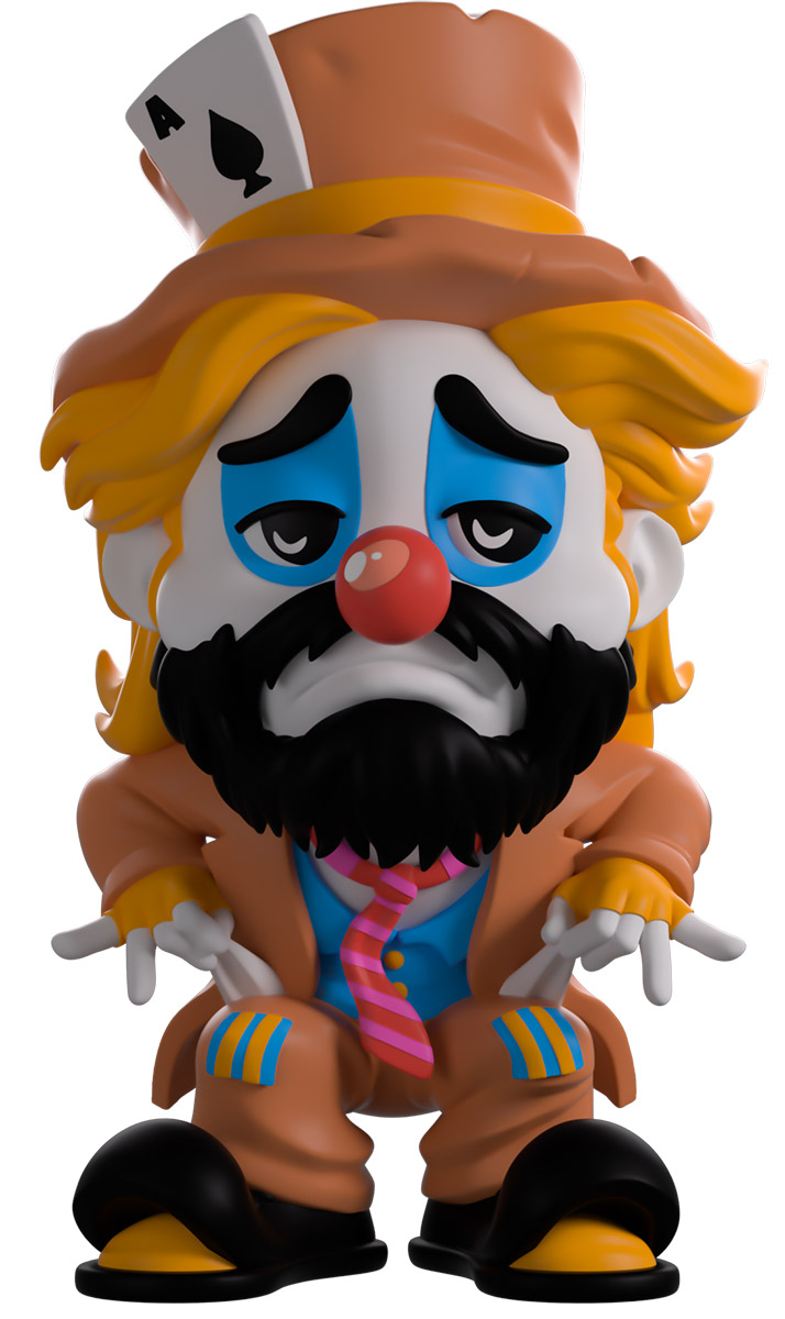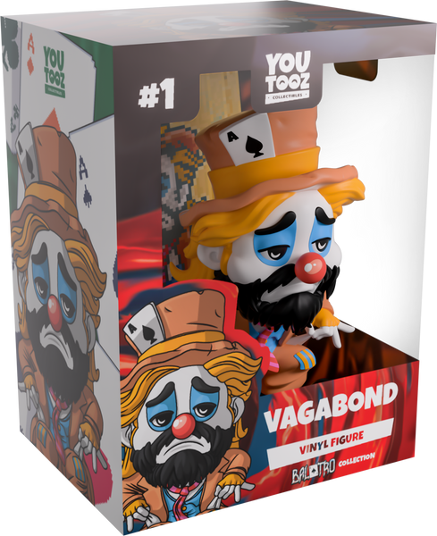 Youtooz has spawned a new card using the Vagabond, what luck! Standing at 4.6 inches tall as he pulls out the pockets of the brown pants to show just how broke he is, a deeply sad frown peeks through his shaggy black beard as a bright red nose rests under blue makeup eyes and curved brows. With long yellow hair curling out from underneath the ragged hat atop his head that has an ace of spades tucked in its band, he wears a red and pink striped tie dangling from his neck over a blue shirt and a brown suit while his socks can be seen through worn black shoes. The exterior of his packaging features a poker hand full of aces and a Joker card at the center, while playing cards litter the interior over a swirling orange background. This then transforms into a vivid red to billow over the protective sleeve, where his figure can be seen through the large, clear window at the packaging’s front. This collectible ships in a matte, embossed, protective outer sleeve and a custom-sized plastic protector for maximum protection during shipping.
