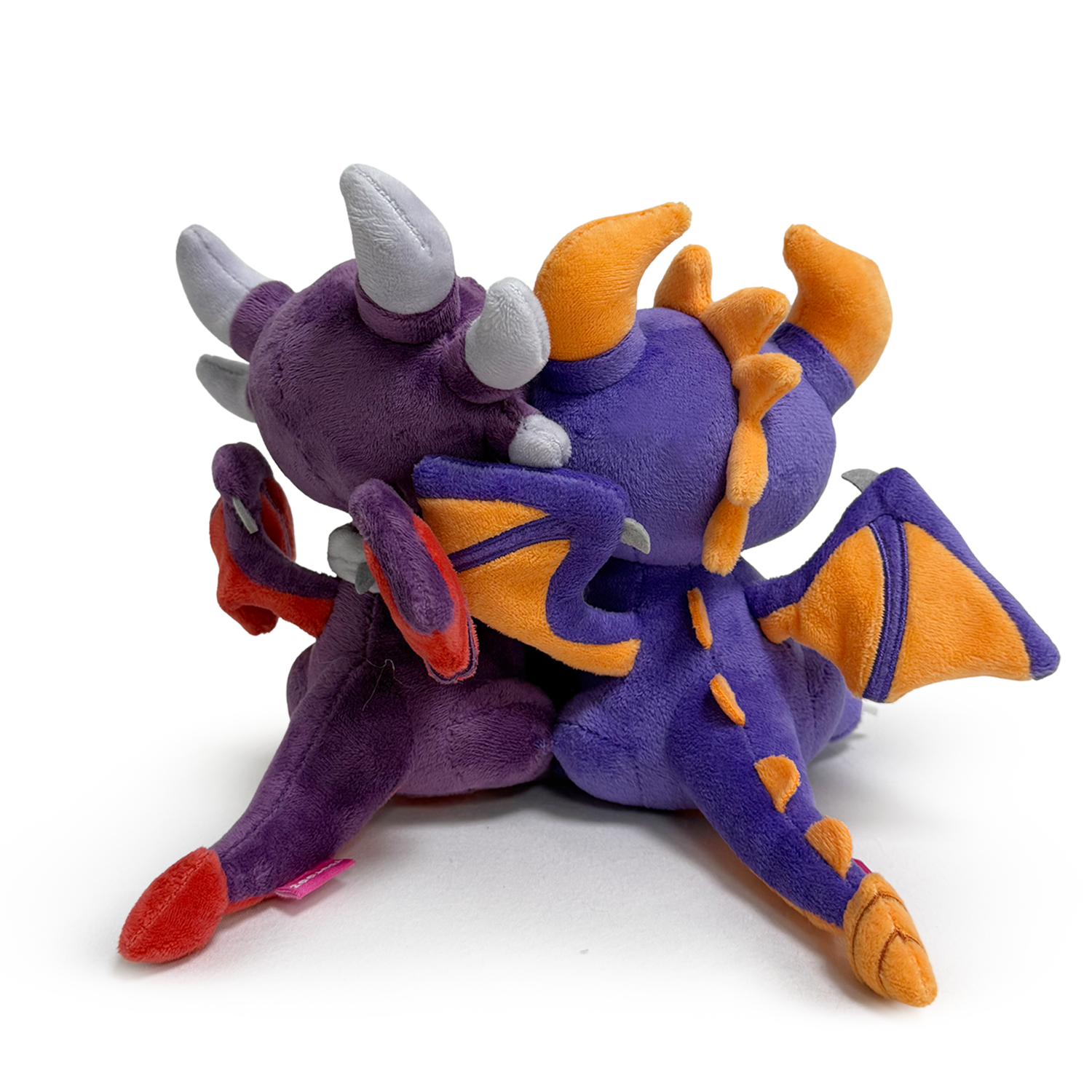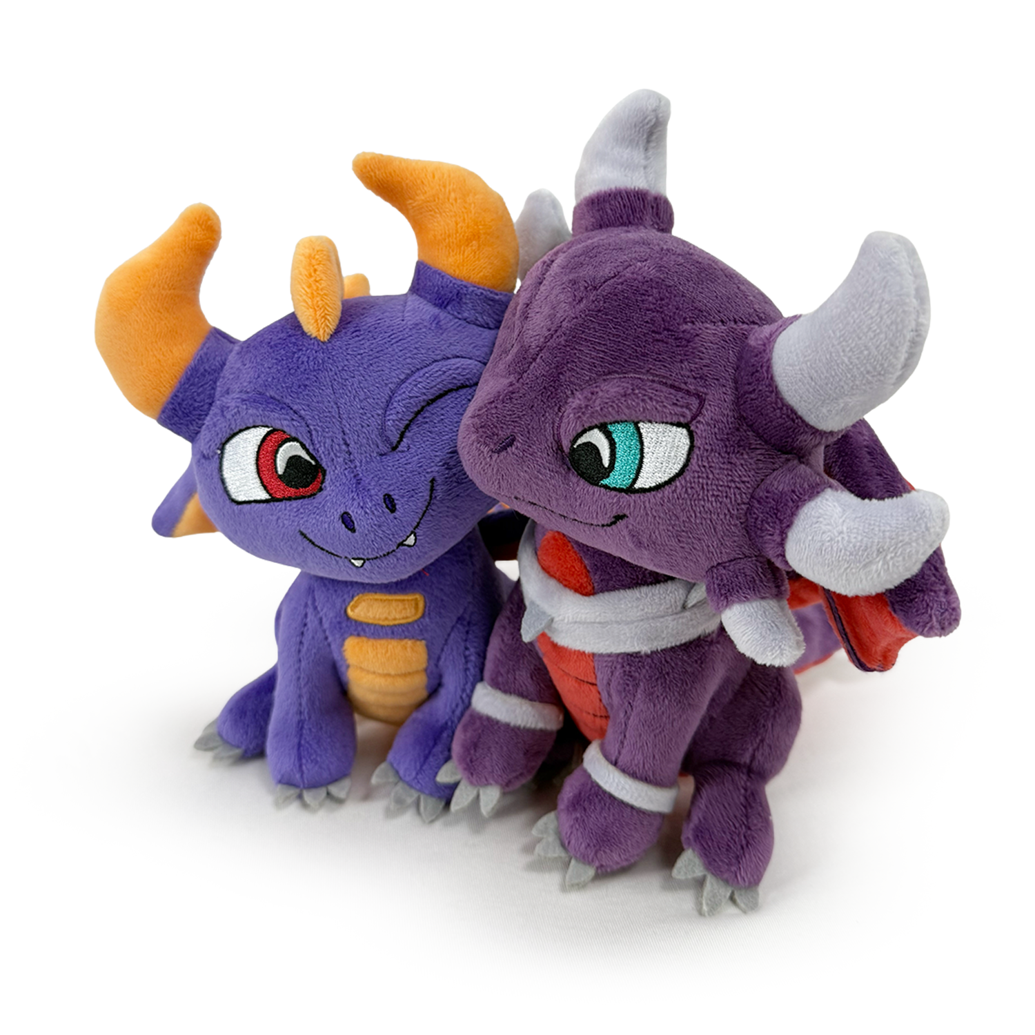 Love is in the air, and this dynamic dragon duo is held aloft with love-filled clouds! Sitting side by side at 6 inches tall with tender cheeks brushing together as they wink at one another, Cynder sits slightly taller than her short king, Spyro, with her deep purple, pink, and grey dragon body. While Spyro sits gleefully next to her with a lighter purple and orange body as both their wings stretch out, ready to ride the winds of love. This plush is inseparable, just like their love for each other and is packed to the seams with 100% PP cotton and is made of the softest minky material, perfect for cuddling or falling in love with!