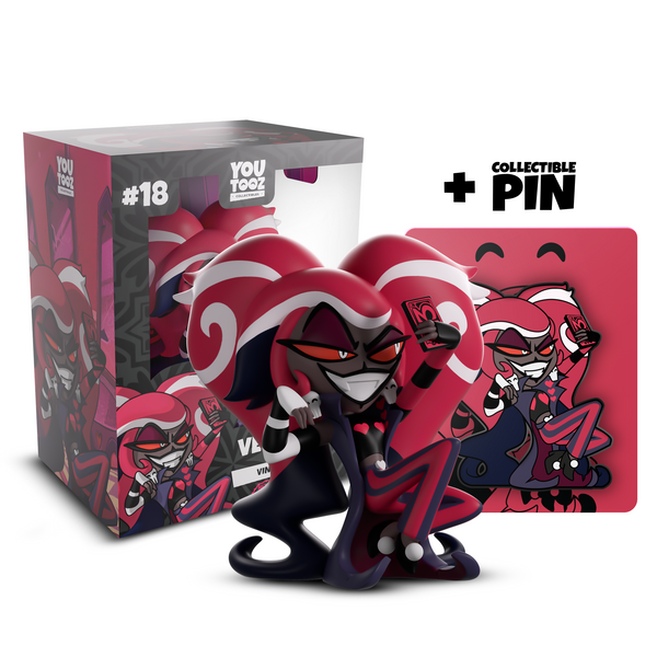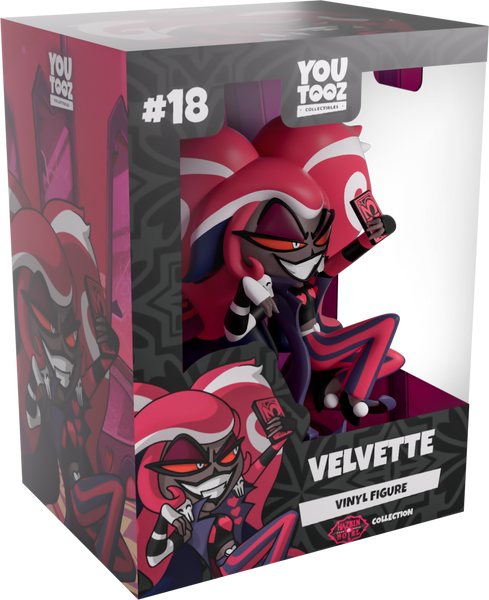 Velvette’s always got her finger on the pulse of everything trendy and has arrived at Youtooz for her very own debut! Just don’t tell her about the other figures! Leaning back at 3.7 inches tall with raised knees as she holds her phone in an outstretched hand to take the perfect selfie, her sly orange eyes peer out from under purple shadowed eyelids as a sharp smile stretches across her face. With voluptuous pink hair that has white stripes and dark tips cascading down her back, she wears a long sleeveless coat with curling ends over a black top, along with striped arm sleeves and pants. The exterior of her packaging sees a blood-smeared room with fabric and accessories along the walls, while the interior looks into a trio of large pink mirrors. The protective sleeve is then designed to show off a dark cityscape as her figure can be seen through the large, clear window at the packaging’s front. This collectible ships in a matte, embossed, protective outer sleeve and a custom-sized plastic protector for maximum protection during shipping.