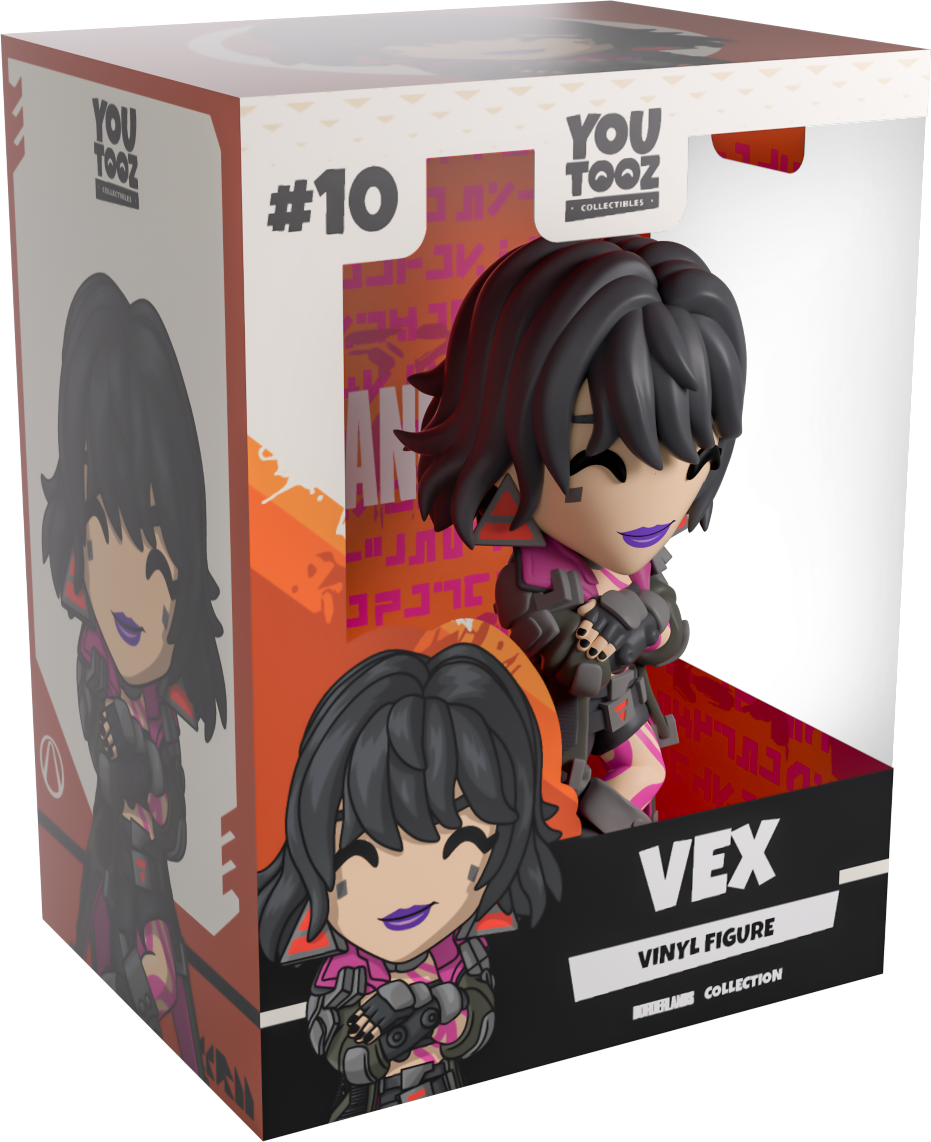 There’s been word of a new Vault at Youtooz, and Vex is here to check things out! Standing at 4.5 inches tall with her arms crossed over her chest and a raised knee, a confident purple smile crosses her face as shaggy black hair falls to either side above triangular red earrings. Dressed in a long jacket with a dark pink interior and a popped collar that falls to the ground around her thick boots, pink markings run along her body and bare left leg as she wears a thin tank top and armored gloves. The exterior of her beige packaging has deep orange lines running through it diagonally, while the interior is covered in strings of blocky pink code. The protective sleeve then continues the same earthy oranges through its middle as her figure can be seen through the large, clear window at the packaging’s front. This collectible ships in a matte, embossed, protective outer sleeve and a custom-sized plastic protector for maximum protection during shipping.