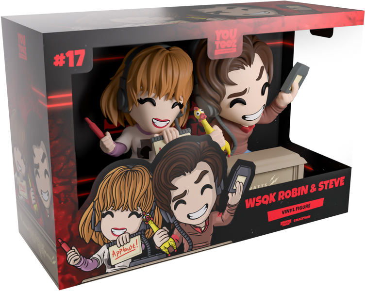 Tune in and turn it up! Robin and Steve have returned to Youtooz for a new figure! Sitting at 5.2 inches tall behind a beige table as huge smiles cross their faces and the cords of their grey headsets lead down to a soundboard, Robin wears a pink t-shirt over a purple long sleeve and holds a sign she’s scrawled ‘Applause!’ on with the red marker in her right hand. While Steve wears a brown long-sleeve shirt with red patches on the sleeves and collar, as he holds a screaming chicken toy in one hand and a tape in the other. The exterior of their packaging sees red vectors of the pair against a black background with faint tendrils working their way across it, while neon red lines blast horizontally through the interior. These then work their way onto the protective sleeve, where their figures can be seen through the large clear window at the packaging’s front. This collectible ships in a matte, embossed, protective outer sleeve and a custom-sized plastic protector for maximum protection during shipping.