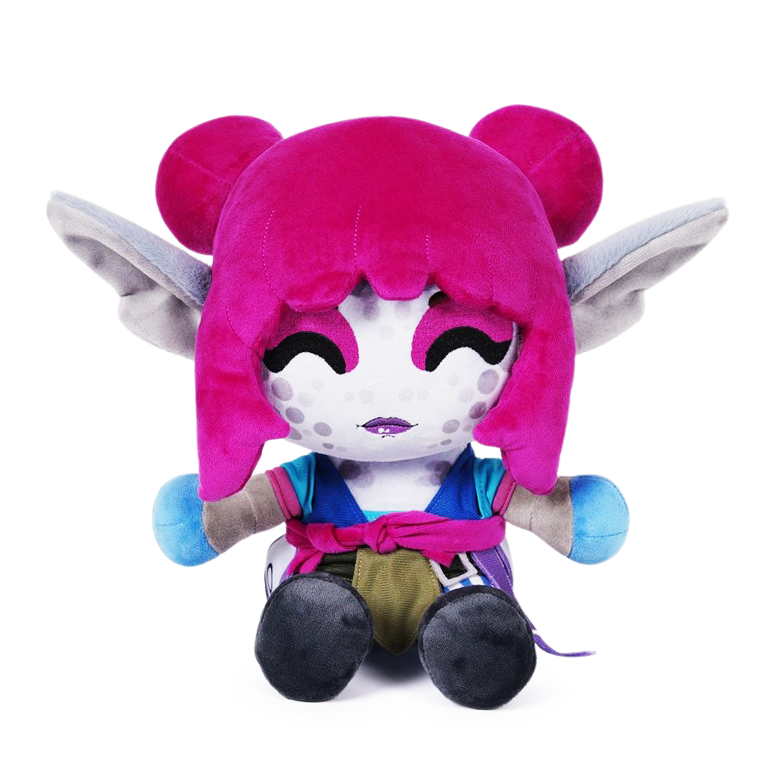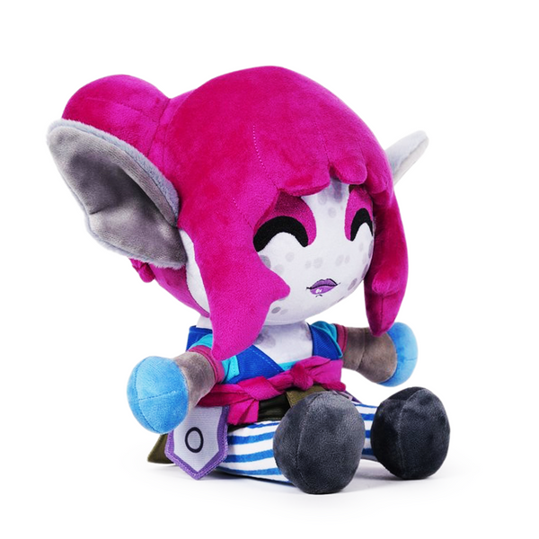 Youtooz was in need of a few party members to help investigate the mysterious Dream Scourge, and Yatzli was more than happy to join up! Sitting at 9 inches tall with shadowy pink eyes and a thick-lipped smile, dark spots speckle her grey face as two long ears stick out from either side and deep pink hair is pulled into a pair of buns atop her head. Wearing an off-the-shoulder blue and pink shirt under a blue vest, a brown tunic and a belt that wraps around her waist above blue and white striped pants that lead down to brown shoes. This plush is packed to the seams with 100% PP cotton and is made of the softest minky material with accents of felt, absolutely perfect for cuddling or studying with!