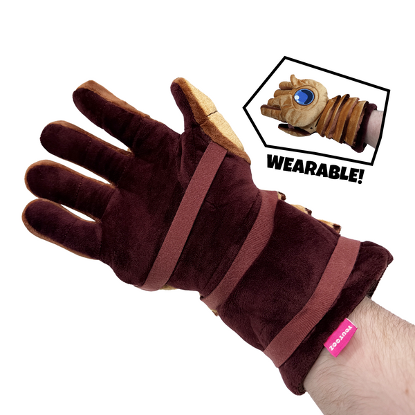Are you ready to grind?! Zizaran has teamed up with Youtooz to bring you your very own gauntlet to show off just how much you’ve decimated your foes! At 9 inches tall with a deep blue gem on the back of its golden hand that has sharp spikes just above the knuckles, four armoured fingers stretch out from the top and match the thumb to the side as thick plates run down the back to an opening which you can reach into, wear, and feel the power! This plush is packed to the seams with 100% PP cotton and is made of minky, brushed, shiny and tricot materials, absolutely perfect for cuddling or blasting bosses with!