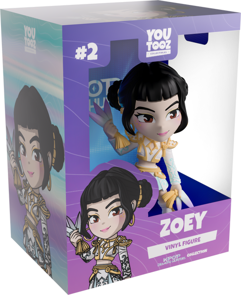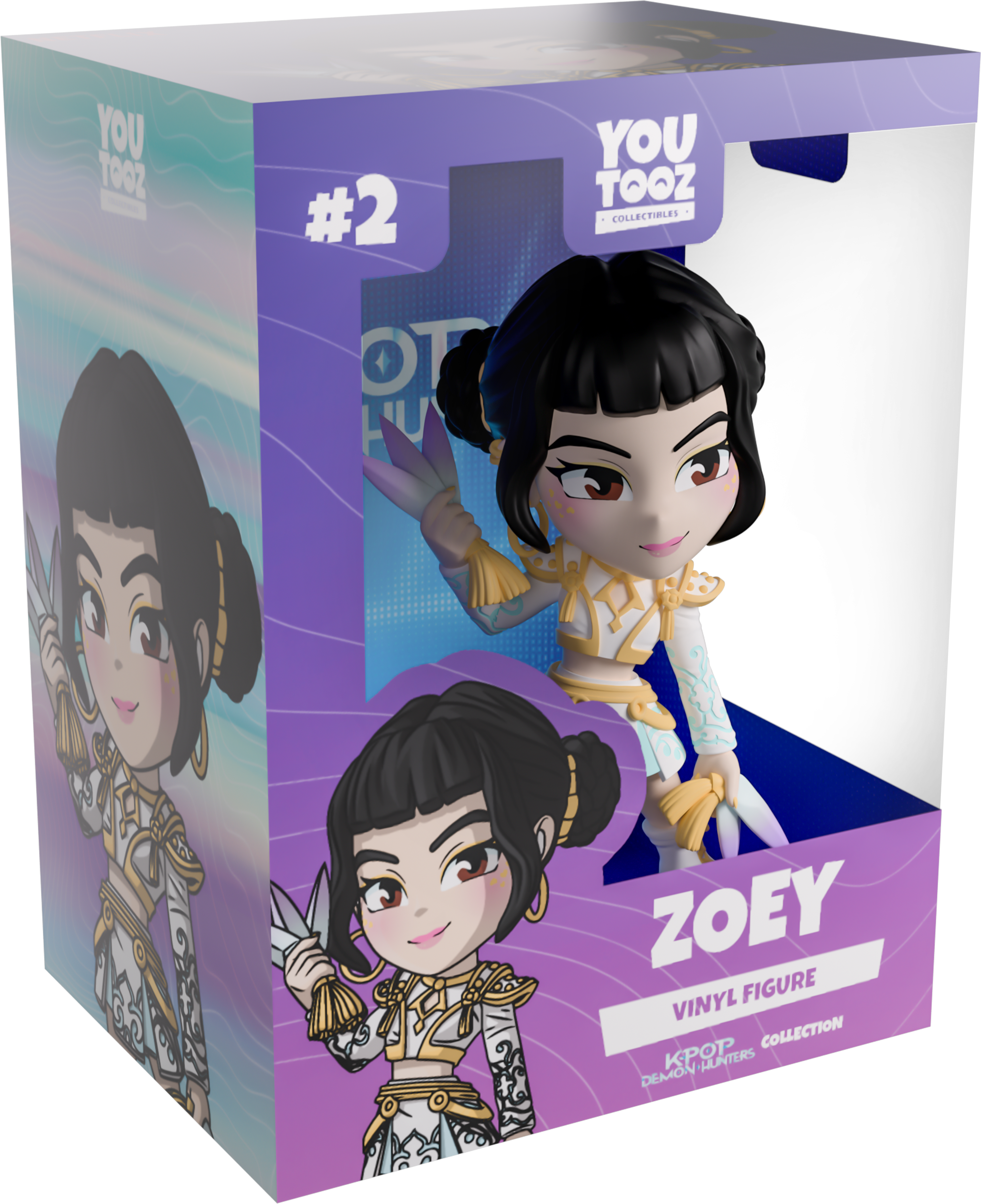 Watch out, demons, Zoey’s here to seal you away with her Youtooz debut! Standing at 4.5 inches tall and holding a trio of purple-tipped shin-kals in each hand as a confident smirk crossed her face, short black hair runs along her forehead in a blunt fringe as long strands fall down either side of heart-marked cheeks, and the bulk is pulled into 2 tight braided buns at the back of her head. Dressed in a long-sleeved white top with golden detailing across the chest and shoulders that matches her short skirt and belt, light purple and blue patterns run along each sleeve as she wears calf-high laced platform boots. The exterior of her packaging features glowing shimmery effects amidst hazy pink and blue hues, while the interior is filled with a deep blue that’s covered in small white dots. The protective sleeve is then a soft blue to purple gradient with thin lines wrapping over its surface, as her figure can be seen through the large, clear window at the packaging’s front. This collectible ships in a matte, embossed, protective outer sleeve and a custom-sized plastic protector for maximum protection during shipping.